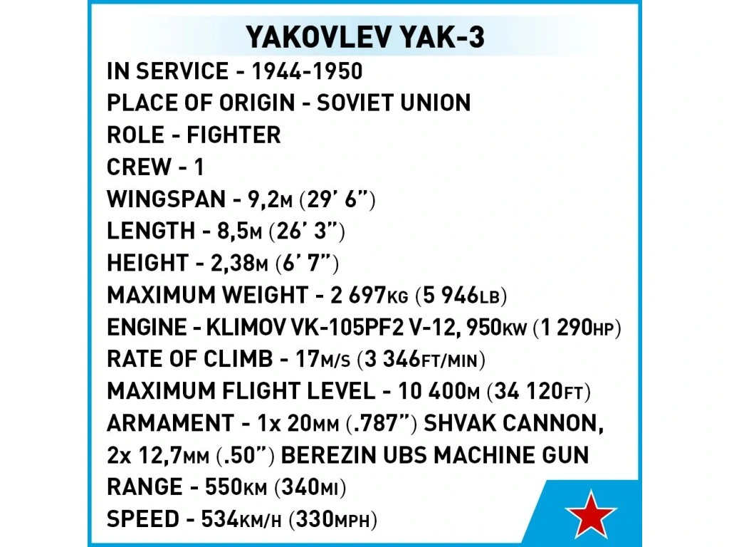 Použijte 140 kostek stavebnice COBI k sestavení historického sovětského stíhacího letadla z 2. světové války. Náš model má jen vysoce kvalitní stálobarevné potisky. V balení nenajdete žádné nálepky. Letadlo měří 18,5 cm na délku a má rozpětí křídel 20 cm. JAK-3 je také snadno sestavitelný model a perfektní začátek vašeho dobrodružství se stavebnicemi COBI. Toto letadlo si zamilují všichni nadšenci letectví, vojenské techniky a historie. Stavějte historii, kostku po kostce.