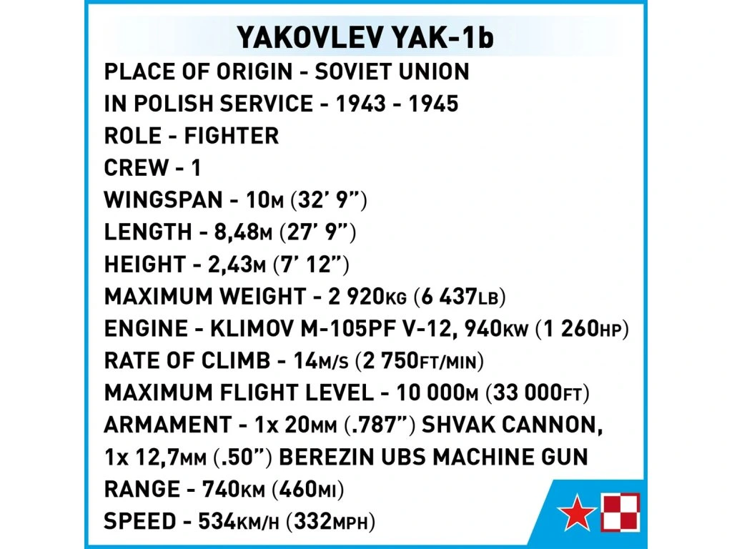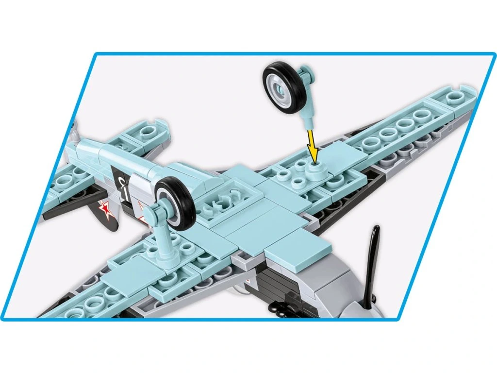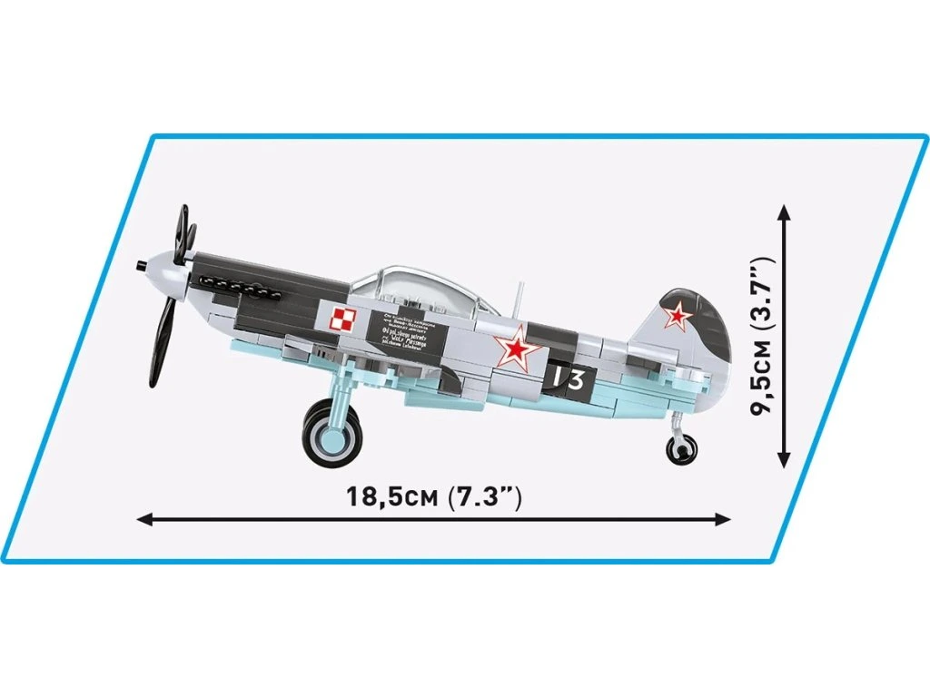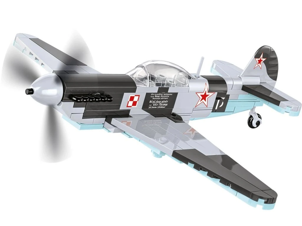 S využitím 142 kostek stavebnice COBI si můžete postavit historické stíhací letadlo, které sloužilo v Polské lidové armádě. Náš model je vybaven vysoce kvalitními potisky a neobsahuje žádné nálepky. Zvlášť pozoruhodná je kostka s nápisem Wolfa Messinga, který daroval letadlo polským pilotům. Letadlo měří 18,5 cm na délku a má rozpětí křídel 22 cm. JAK-1b je snadno sestavitelný model, ideální pro začátek vašeho dobrodružství se stavebnicemi COBI. Toto letadlo si zaslouží zvláštní pozornost nadšenců letectví, vojenské techniky a historie. Stavějte historii, kostku po kostce.