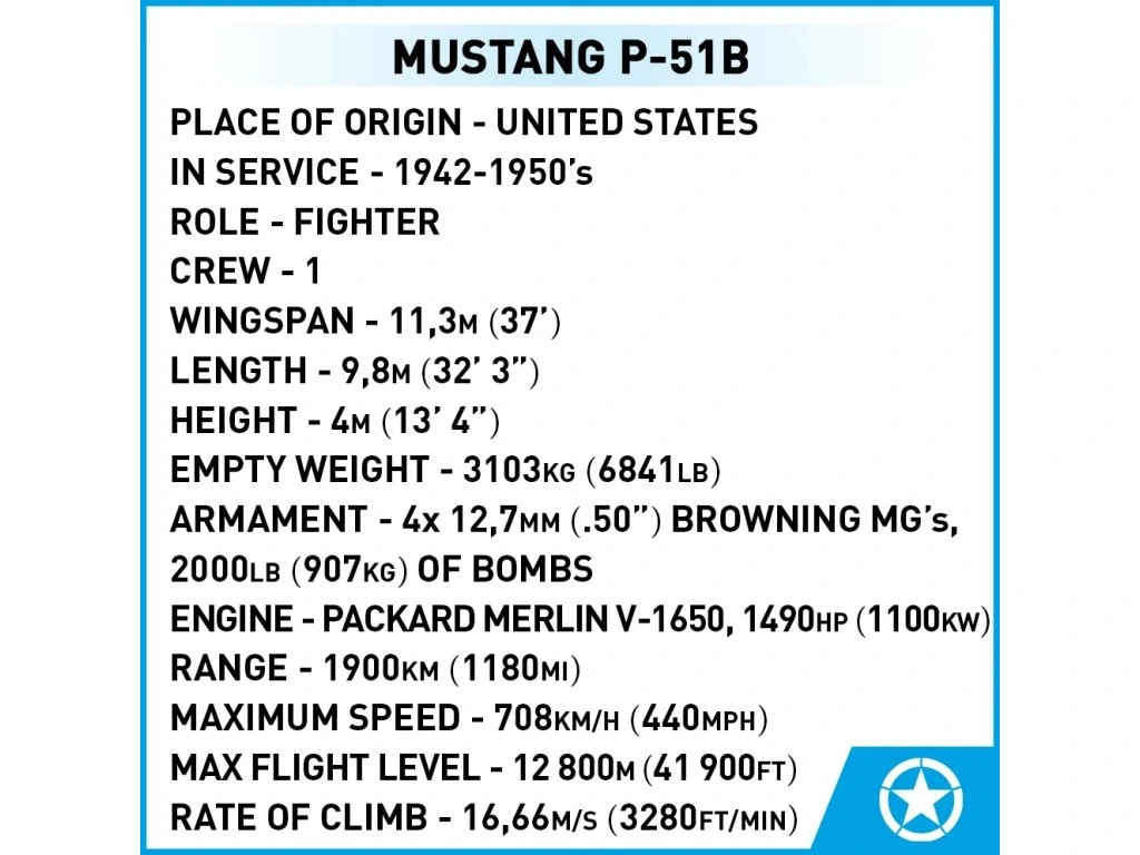 Postavte si svůj vlastní Mustang P-51B a připomeňte si éru hrdinství spojeneckých pilotů nad Evropou. Model spojuje zábavu, historii a skvělý design do jedné stavebnice.