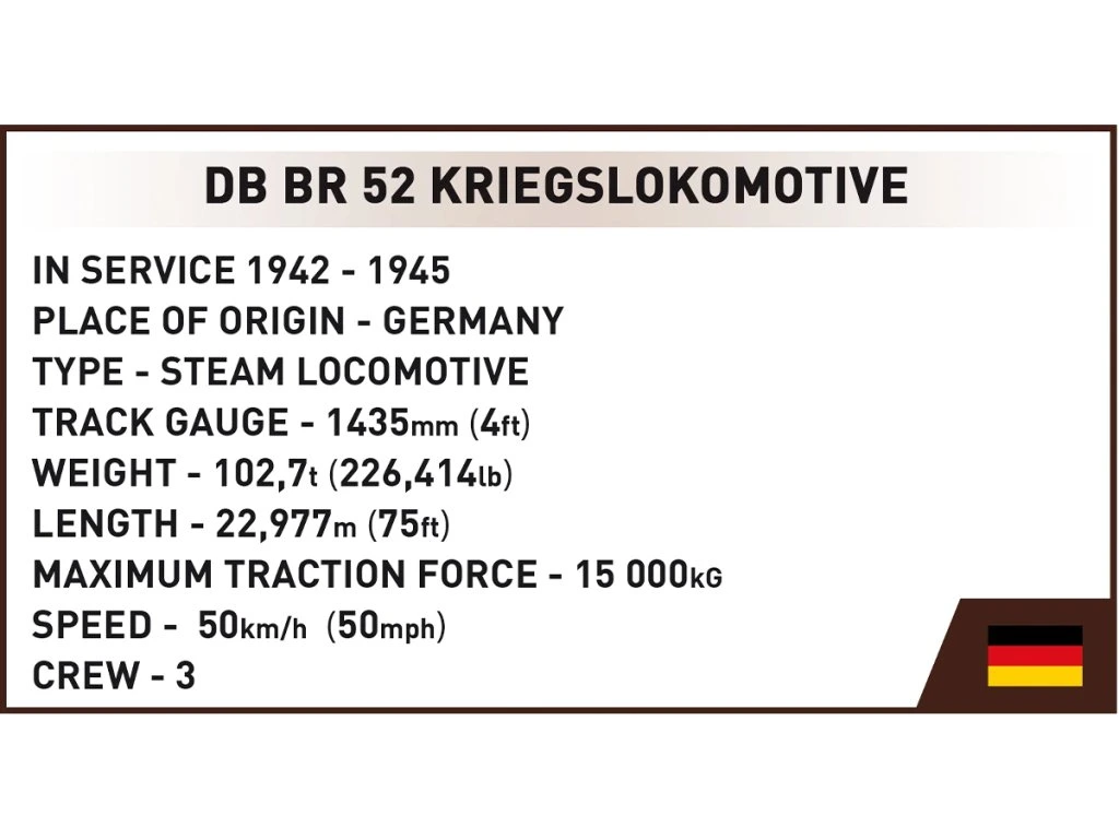 BR 52 byla hromadně vyráběná německá parní lokomotiva v letech 1942–1945, známá svou jednoduchostí, spolehlivostí a schopností přepravovat nákladní vlaky až do 1 700 tun. Tento model zachycuje všechny detaily originálu: karoserii, proporce, kabinu, nátěr v šedé kamufláži a historické označení z východní fronty.