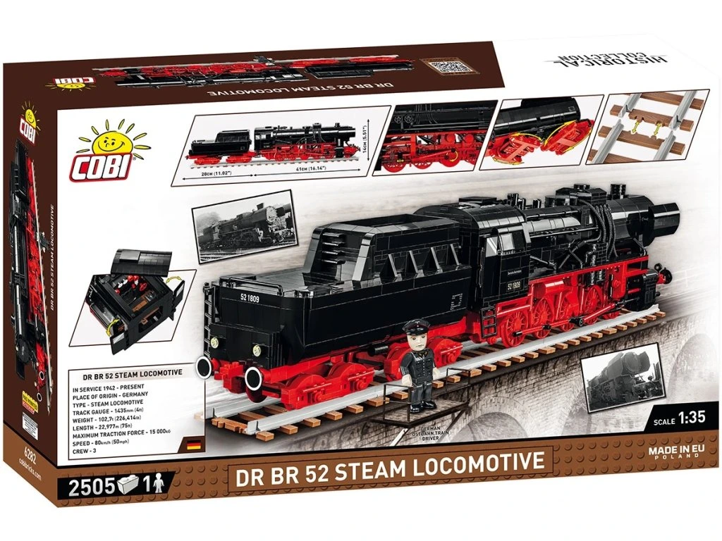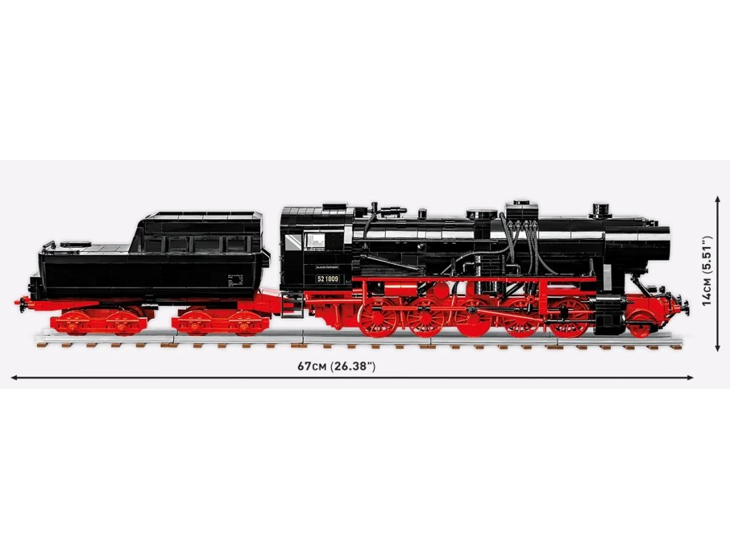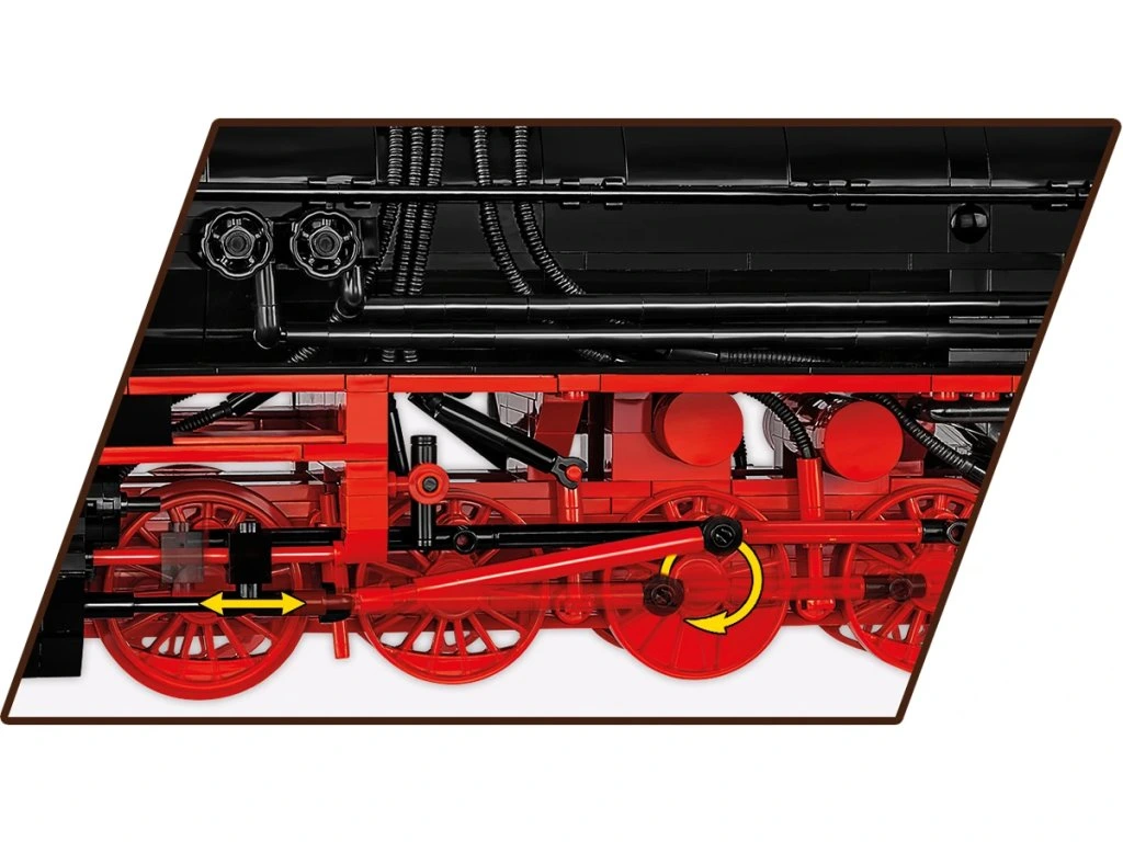 COBI model věrně reprodukuje karoserii, proporce a detaily legendární parní lokomotivy, která patří mezi nejznámější železniční vozidla na světě. Model je navržen v měřítku 1:35 a obsahuje množství detailů, jako jsou symboly, číslování, označení a početné potisky uvnitř strojovny. Díky odnímatelné střeše strojovny můžete nahlédnout dovnitř a prozkoumat věrně reprodukované přístroje a zařízení používané k pohonu lokomotivy. V kotli dokonce uvidíte hořící uhlí!
