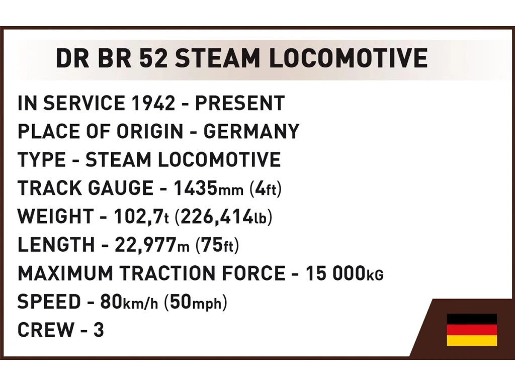 Stejně jako skutečná parní lokomotiva jsou lokomotiva a tender propojené, takže se pohybují současně. Uvnitř se nacházejí ozubená kola tvořící složitý mechanismus zajišťující realistický pohyb kol a celého pohonu. Stačí jemně zatlačit a celá lokomotiva se rozjede. Sada obsahuje i figurku německého strojvedoucího v uniformě z druhé světové války.
