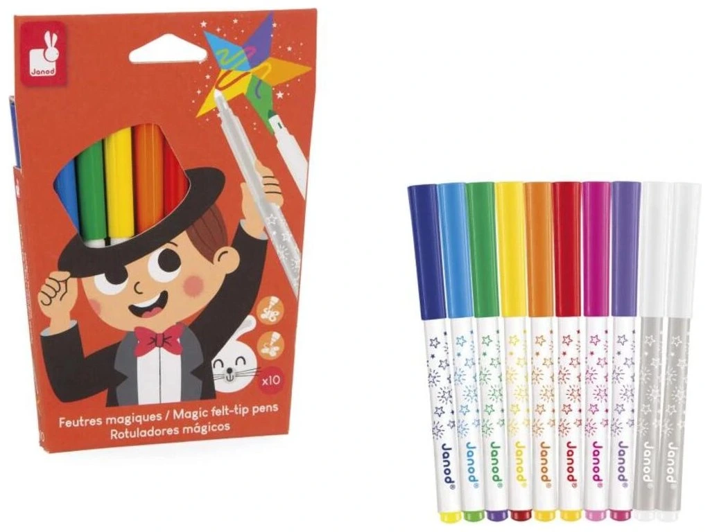 Sada 10 magických fixů Janod – kolekce Colo (3+)Je to kouzlo! Tato sada 10 magických fixů je vhodná pro děti od 3 let a nabízí zářivou paletu barev se speciální funkcí, která překvapí a nadchne malé umělce. Fixy umožňují vytvářet kresby, které mění barvu po použití vývojového fixu – ideální pro hodiny kreativní zábavy a úžasných efektů.
