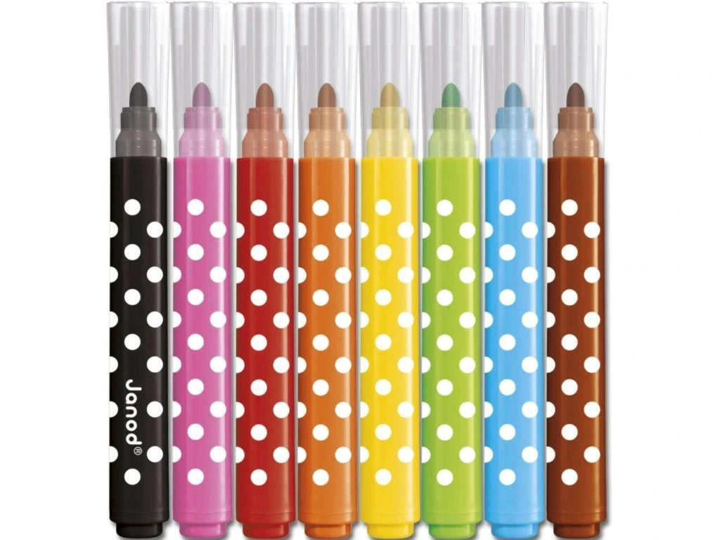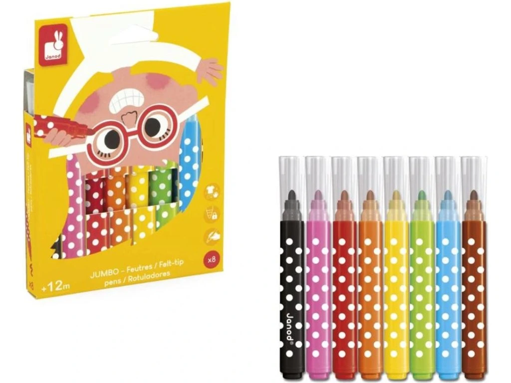 Sada 8 fixů JUMBO Janod – kolekce Colo (12+ měsíců)Hroty fixů velikosti JUMBO! Tato sada 8 fixů je ideální pro děti již od 12 měsíců a umožňuje jim objevovat radost z prvních kreseb. Velké plstěné hroty jsou speciálně navržené pro malé ruce a bezpečný hrot zaručuje pohodlné a bezpečné kreslení.