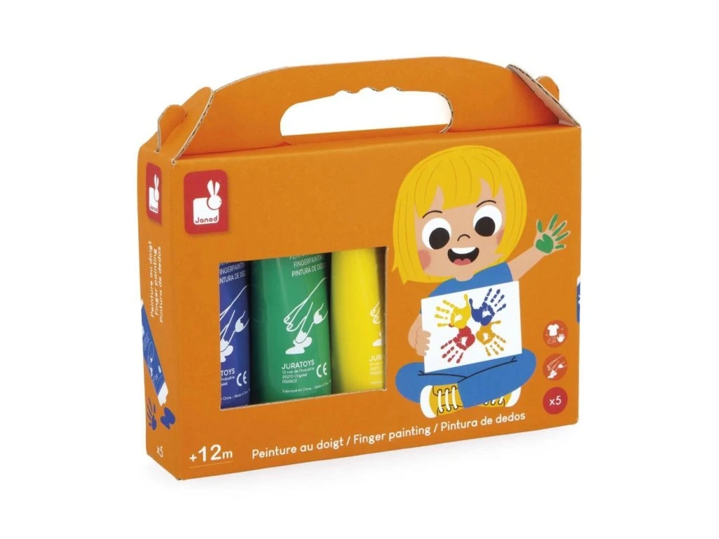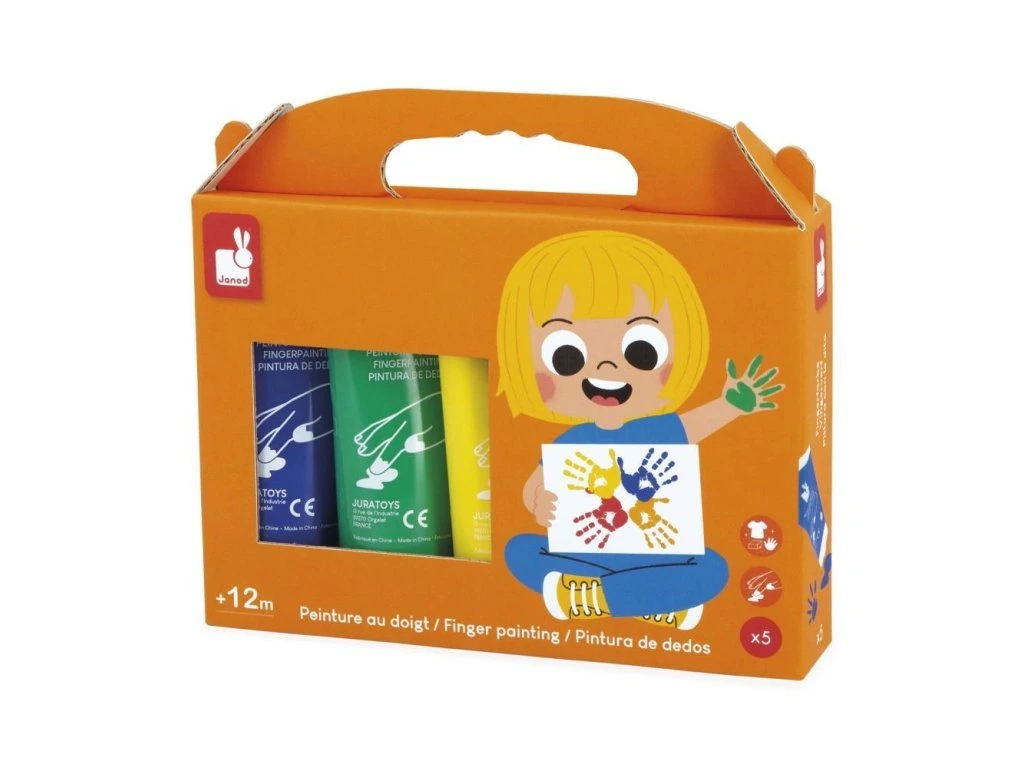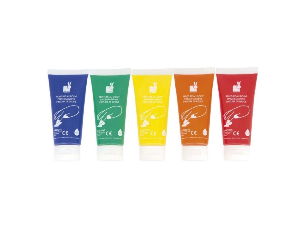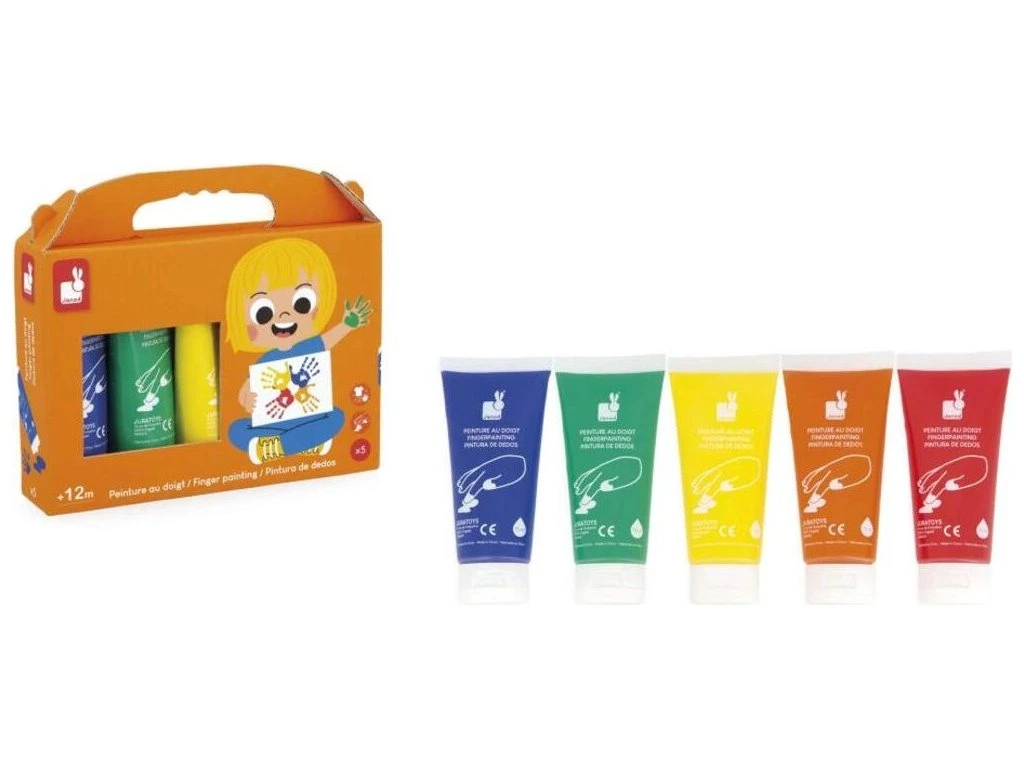 Sada 5 dětských barev na prsty Janod – kolekce Colo (1+ rok)S těmito 5 tubami dětských barev mohou děti už od 1 roku svobodně objevovat své umělecké schopnosti. Každá tuba obsahuje 75 ml barvy, takže vydrží na dlouhé kreativní chvíle. Barvy jsou ideální na rozvoj jemné motoriky a kreativity a zároveň přinášejí množství barevné zábavy.