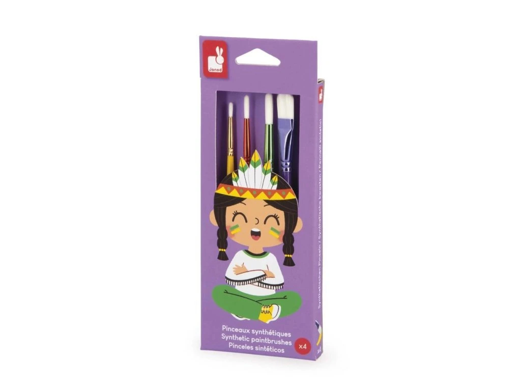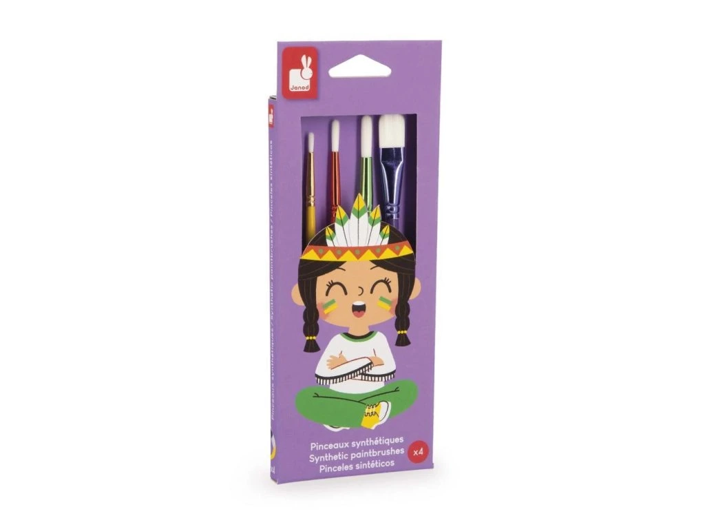 Sada 4 štětců Janod – kolekce Colo (3+)Tato sada 4 štětců je ideální pro seznámení dětí od 3 let s radostí z kreslení a malování. Štětce mají různé tvary a velikosti, které umožňují používat rozmanité malířské techniky a stimulovat kreativitu a představivost malých umělců.