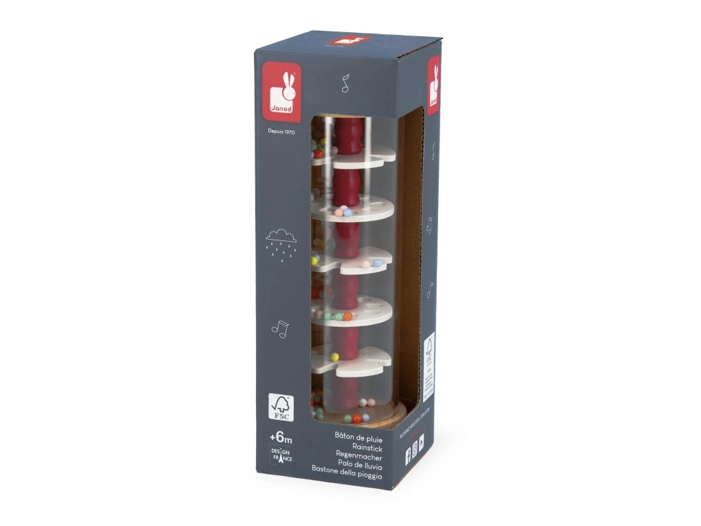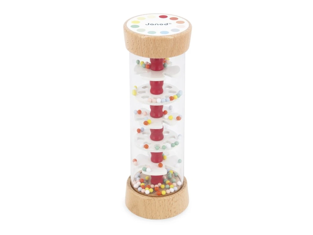 Dřevěná deštová hůlka Janod – hudební hračka (6+ měsíců)Tato krásná deštová hůlka je perfektní hračkou pro hudební probouzení dětí. Když se kuličky pohybují, vydávají jemný a uklidňující zvuk připomínající padající déšť. Ergonomický design je přizpůsobený malým ručkám, takže je hračka pohodlná a bezpečná pro nejmenší děti.