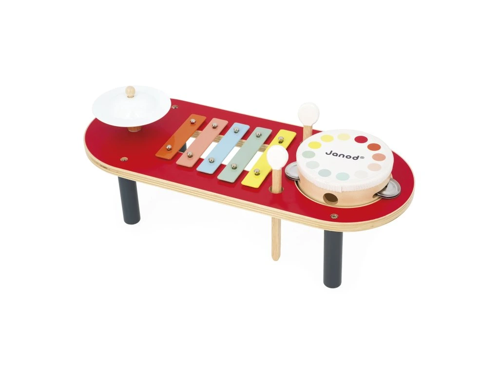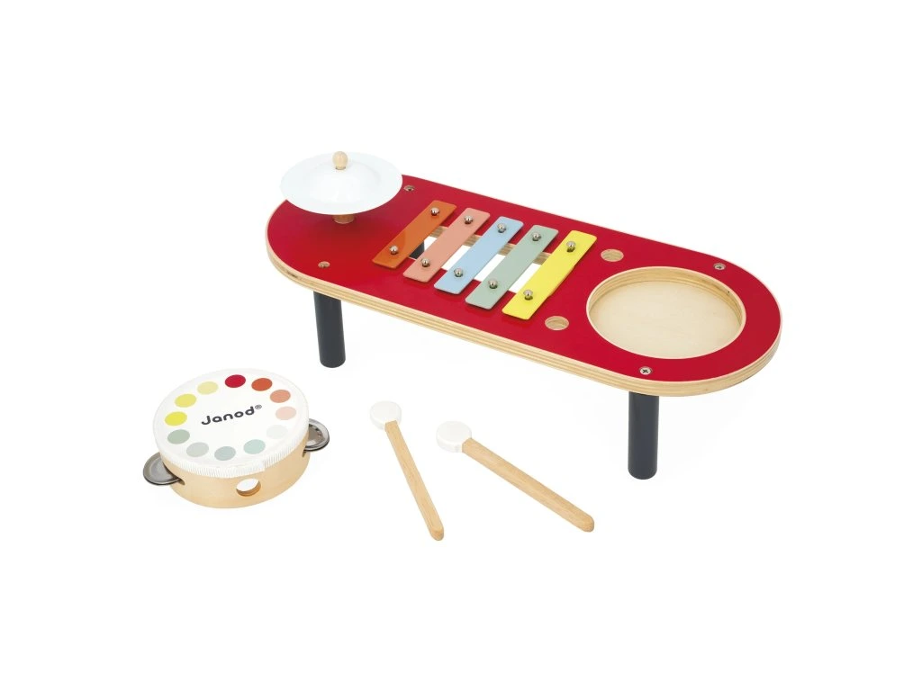 Barevný hudební stolek Janod – buben, činel a xylofon (18+ měsíců)Koncert může začít! S tímto barevným hudebním stolkem si nejmenší mohou vymýšlet svou první hudbu. Stolek obsahuje činel, buben a xylofon, takže děti mohou experimentovat s různými zvuky a rytmem. Praktické: paličky se dají pohodlně uložit do otvorů na stole, aby se neztratily.