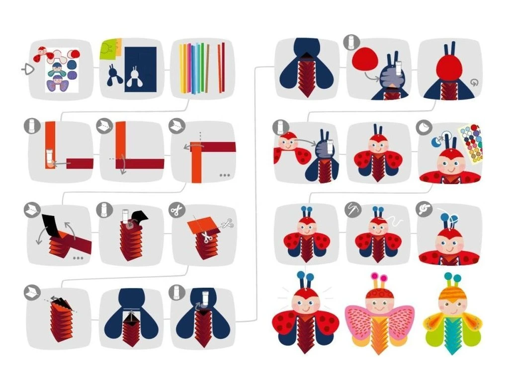 Kreativní sada Janod – skládání brouků a motýlůPozor, teď jsou věci roztomilé! Roztomilé tváře a křídla brouků a motýlů jsou připravené z předem nařezaného fotokartonů a čekají na svá těla. Děti od 3 let je pomocí skládacích pásků jednoduše poskladají jako schody. Nakonec slepte jednotlivé části k sobě a získáte kouzelnou jarní dekoraci, která zkrášlí každý pokoj nebo třídu.