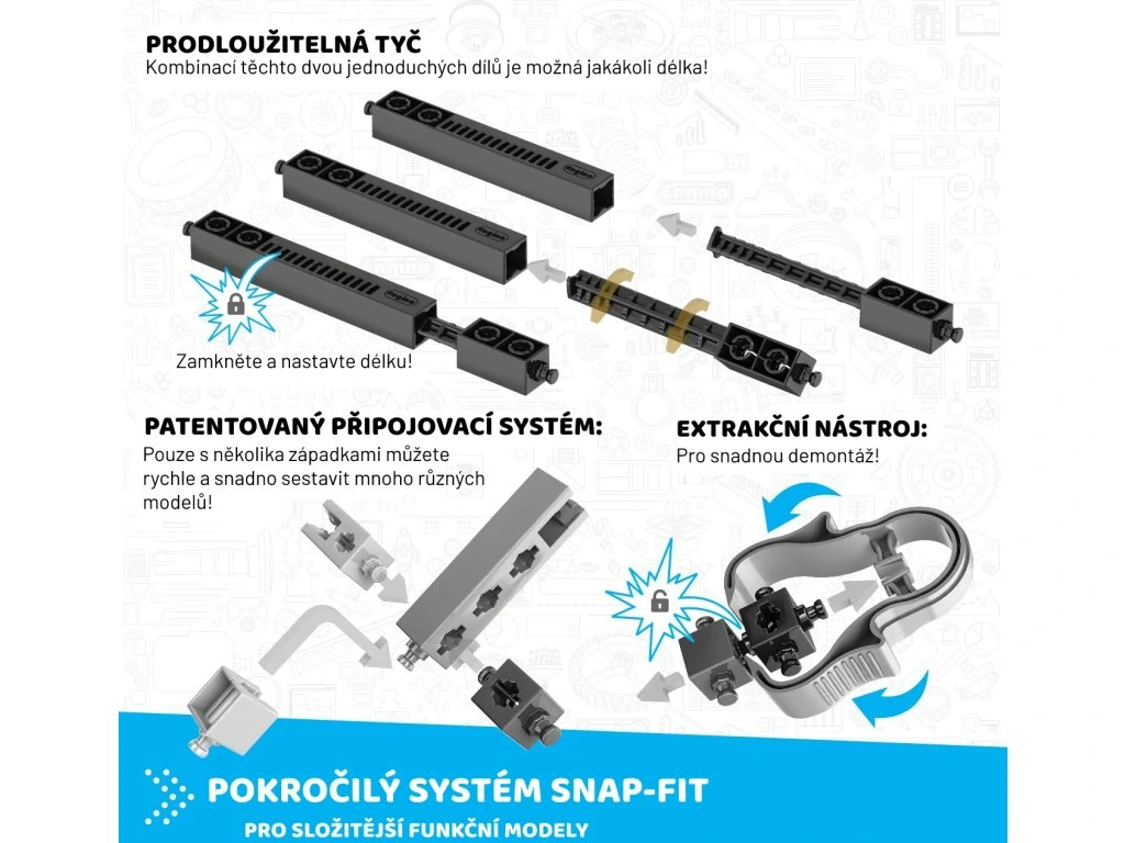 - 210 dílů na sestavení 30 modelů (např. vesmírná raketa, lunární vozík, zimní skútr, formule, motorka a další)