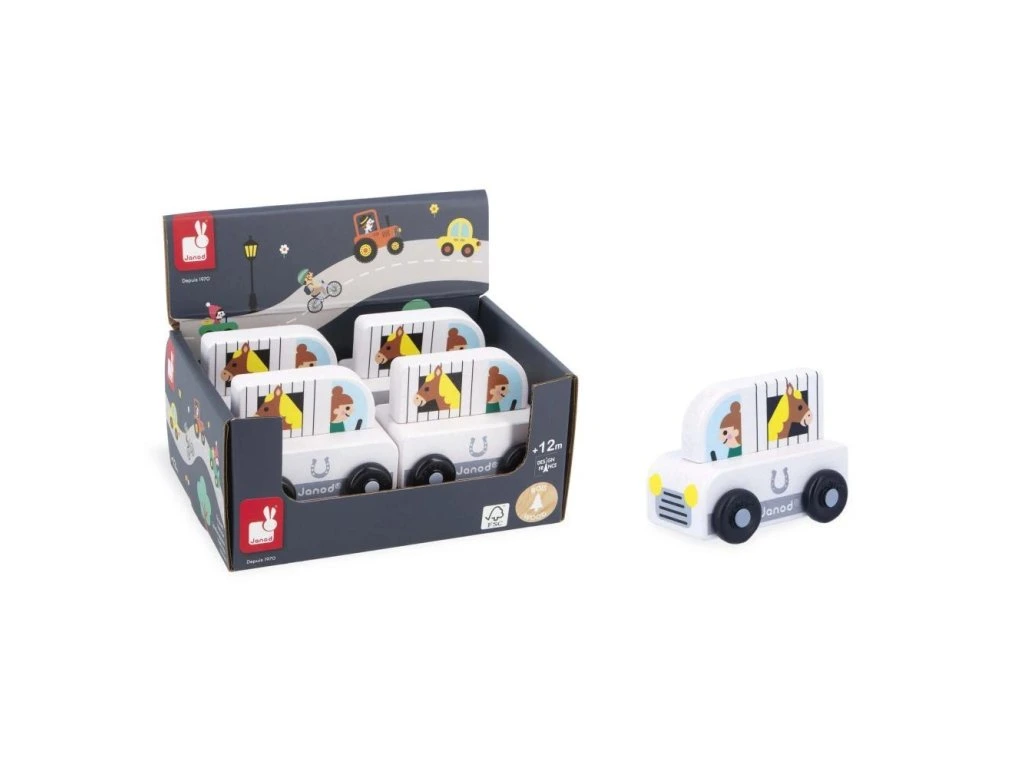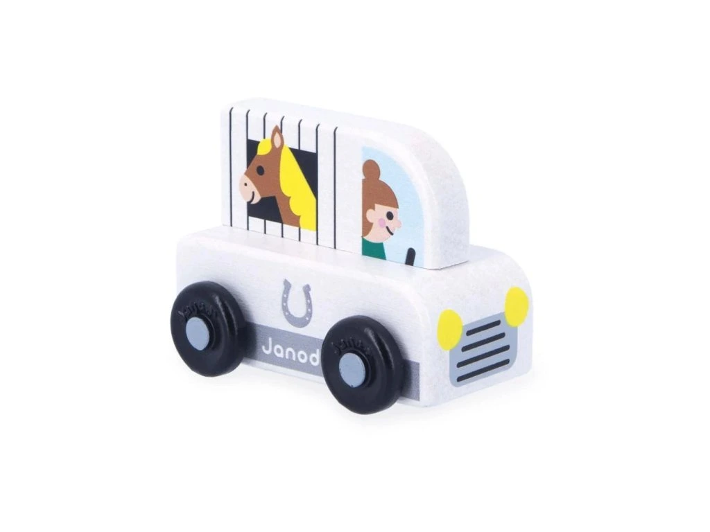 Malé dřevěné auto s koňským přívěsem – JanodMalé dřevěné auto, se kterým si děti snadno hrají a rozvíjejí svou představivost a motoriku. Při cestování s tímto autíčkem zažijí děti množství příběhů a dobrodružství.