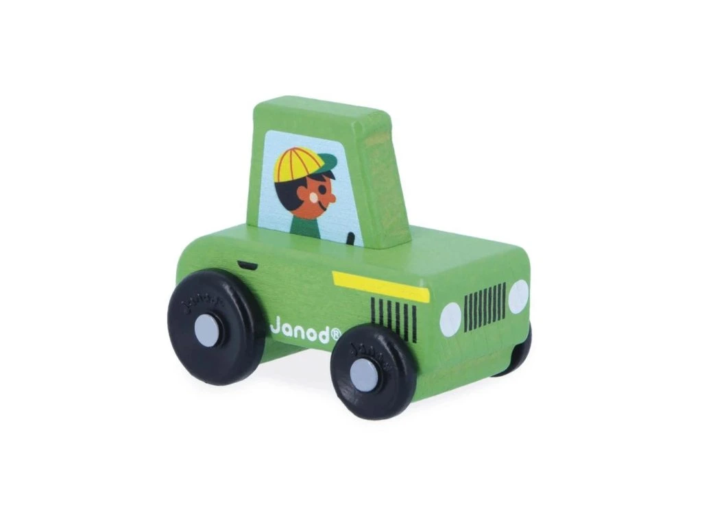 Dřevěný traktor – JanodMalý dřevěný traktor, se kterým si děti lehce hrají a rozvíjejí svou představivost a jemnou motoriku. Farmář se svým zeleným traktorem vyjíždí na louky sbírat balíky slámy! Tento ergonomicky tvarovaný traktor umožňuje nejmenším pohodlné uchopení a kolébání vozidla.