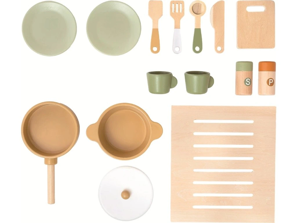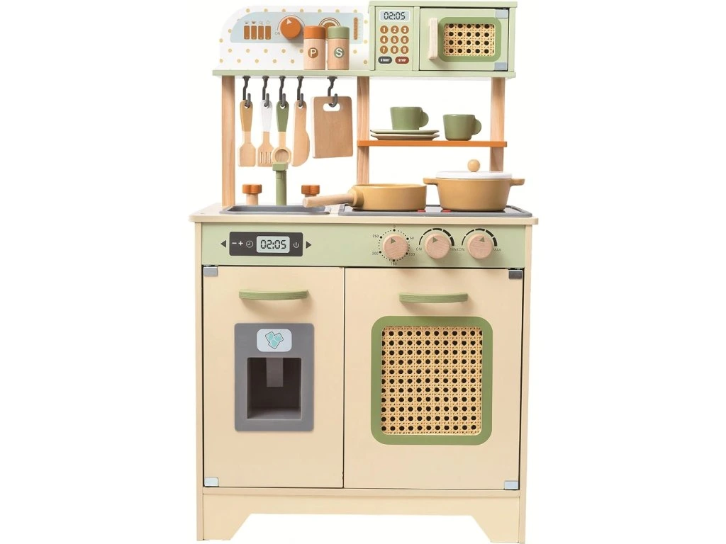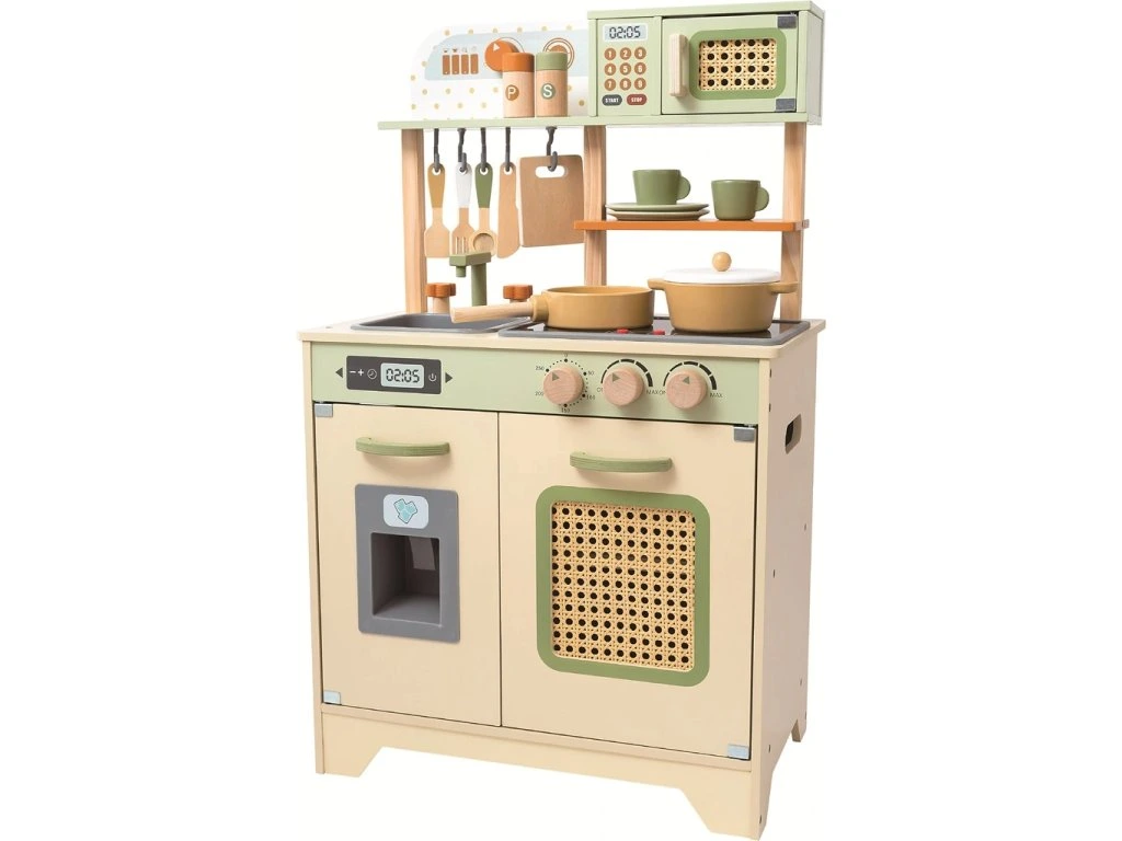 Díky otevíracím dvířkům a otočným knoflíkům je zážitek ze hry ještě realističtější. Všechno je vyrobeno z kvalitního pevného dřeva a ošetřeno netoxickými barvami.
