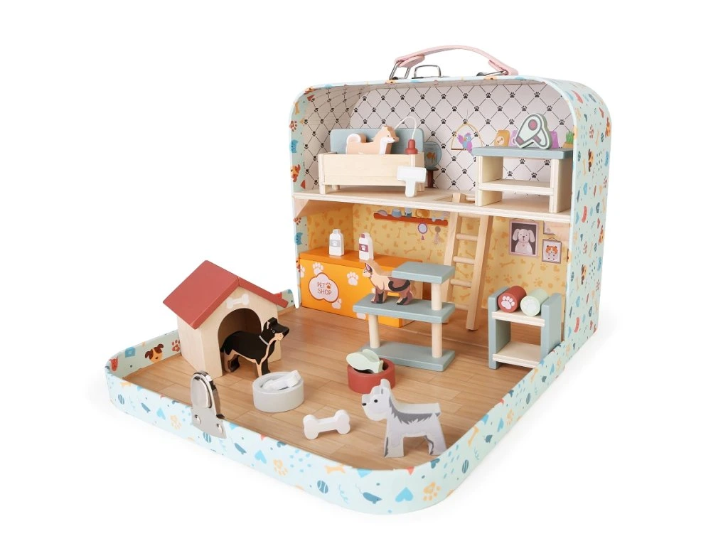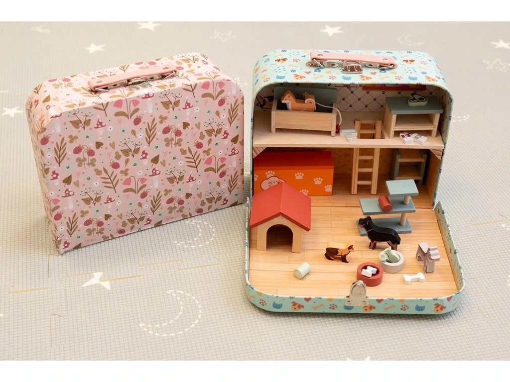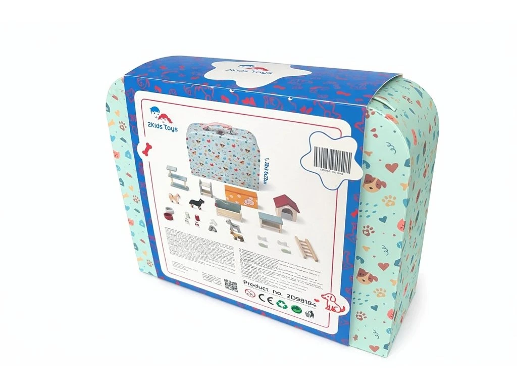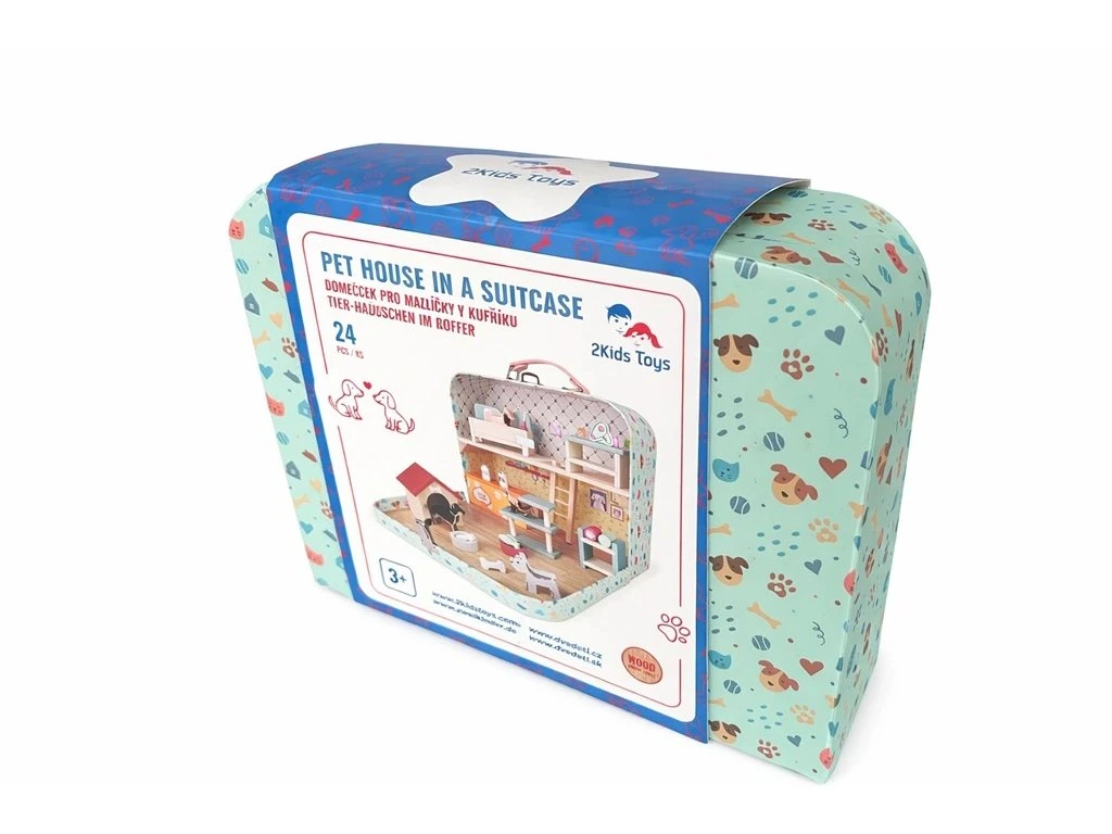 Mějte v ruce svůj vlastní psí svět. Domček pro domácí mazlíčky v kufříku je malý svět velkých dobrodružství! Představte si kouzelný kufřík, který se po otevření promění v útulný domov pro pejsky. Pejsci různých plemen, stylové doplňky jako misky, kosti, rybičky, hračky, bouda, pelíšky, krmivo a další – to všechno pěkně pohromadě v jednom balení. Děti si mohou samy vytvářet příběhy a scénky se svými psími kamarády. Ideální hračka na cesty i domů.