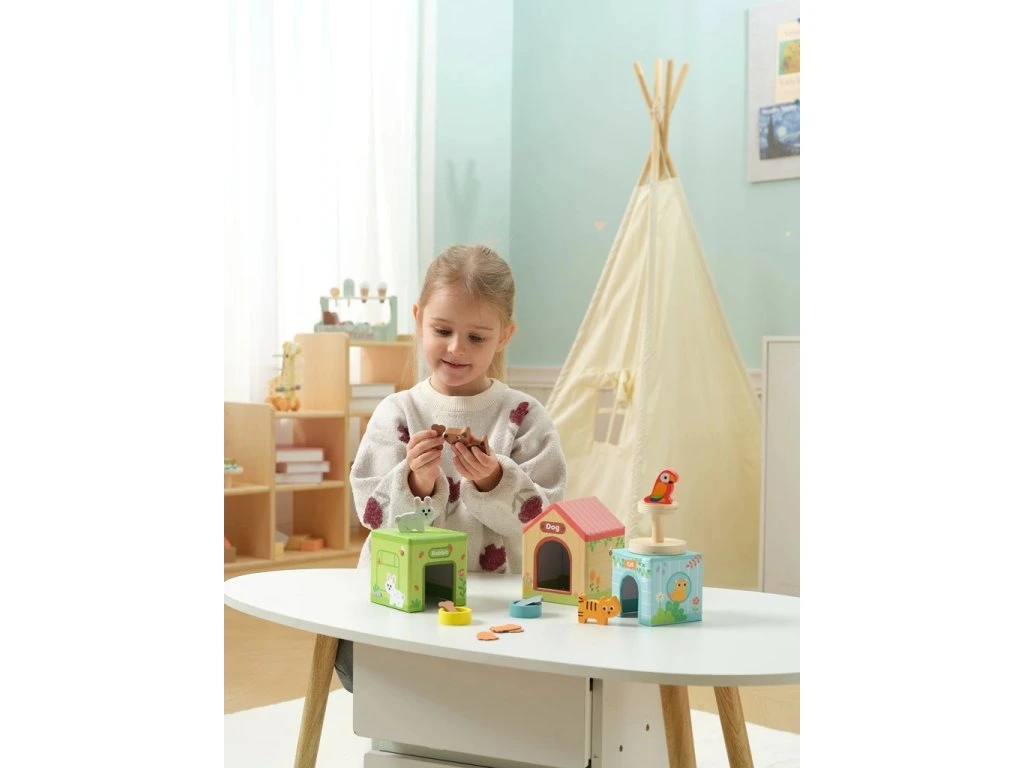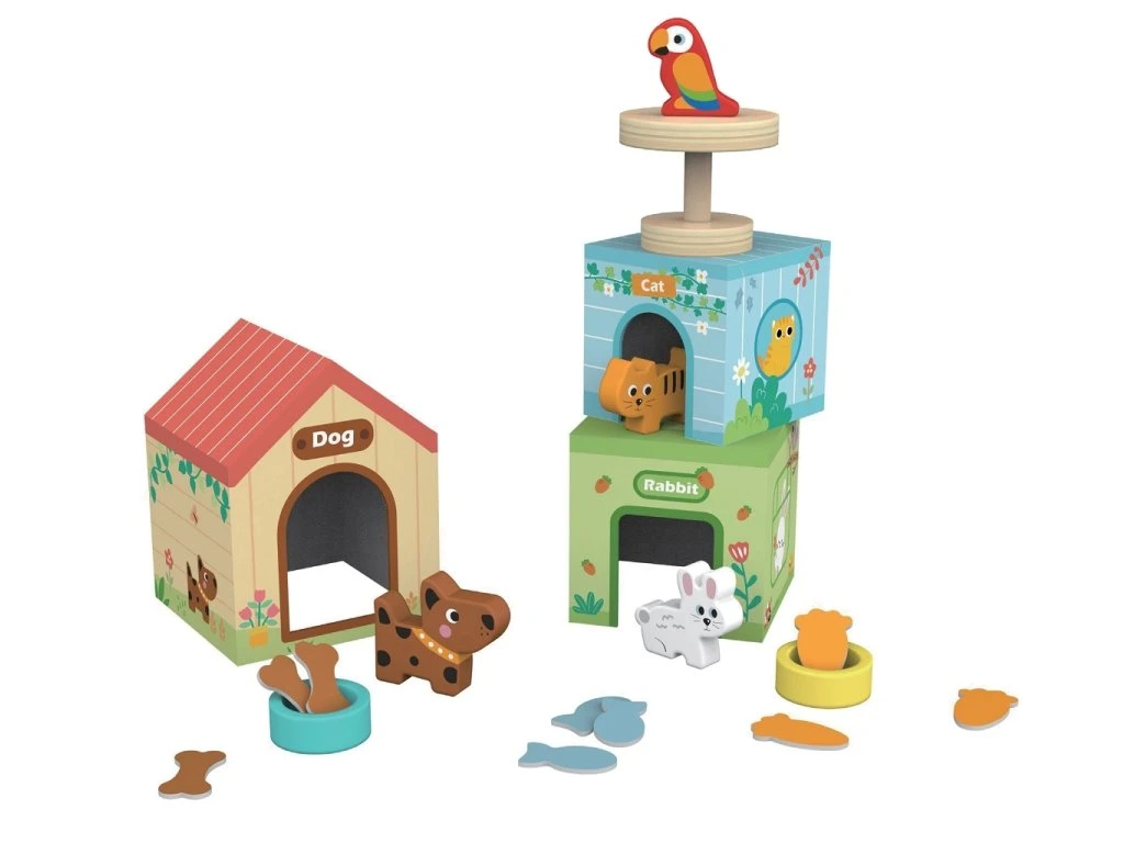 Užijte si spoustu zábavy se svými dřevěnými mazlíčky! Pes, kočka i zajíček mají každý svůj domček i jídlo a z budky na ně dohlíží papoušek.