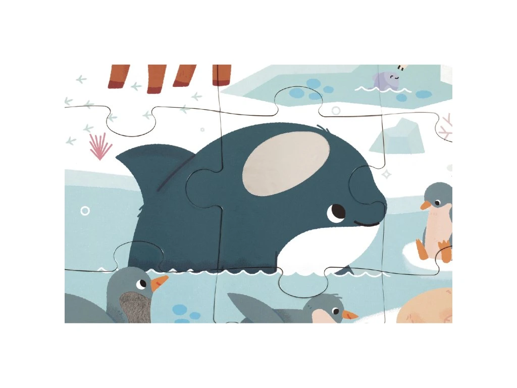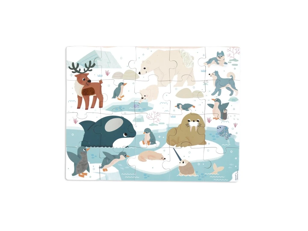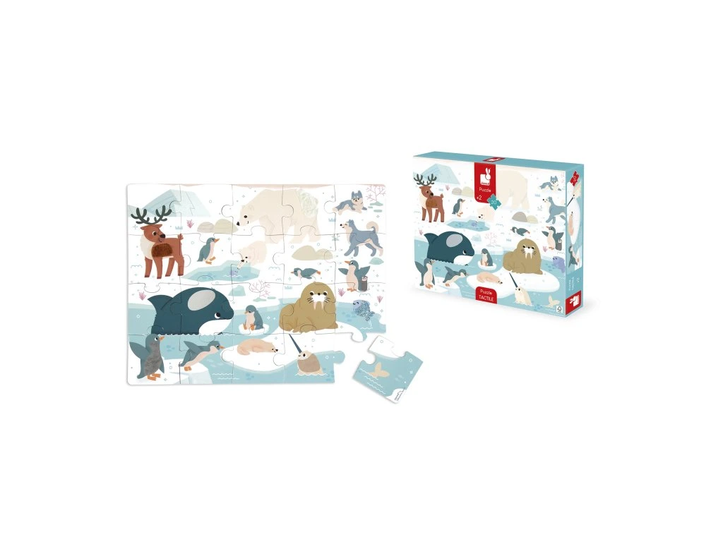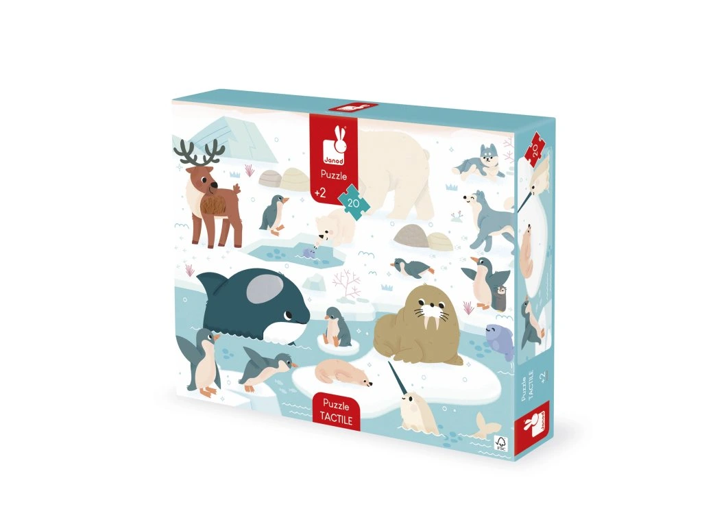 Hmatové puzzle – polární zvířataVydejte se na cestu za objevováním polárních oblastí a jejich zvířat s tímto velkým 20dílným hmatovým puzzle! Sedm dílků obsahuje různé textury, které dětem umožní poznat materiály a rozvíjet jemnou motoriku a hmatové schopnosti. Pomocí přiloženého plakátu si mohou děti puzzle snadno poskládat.