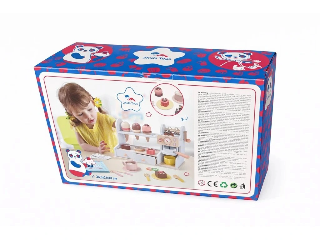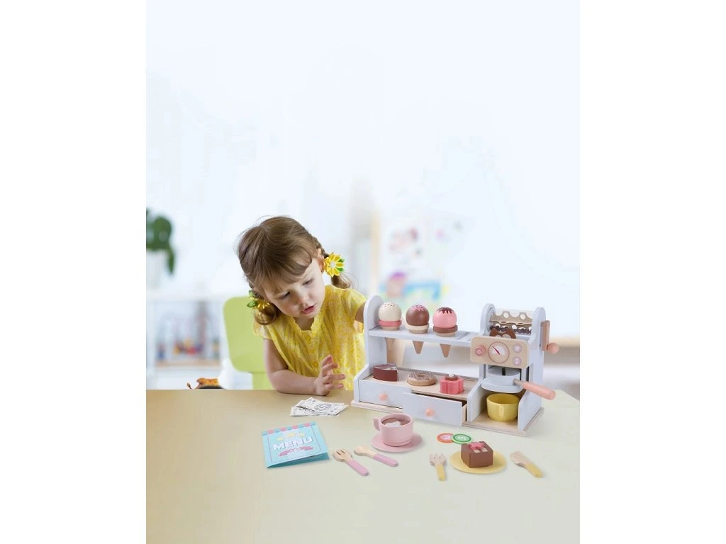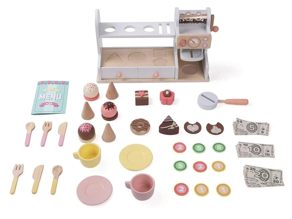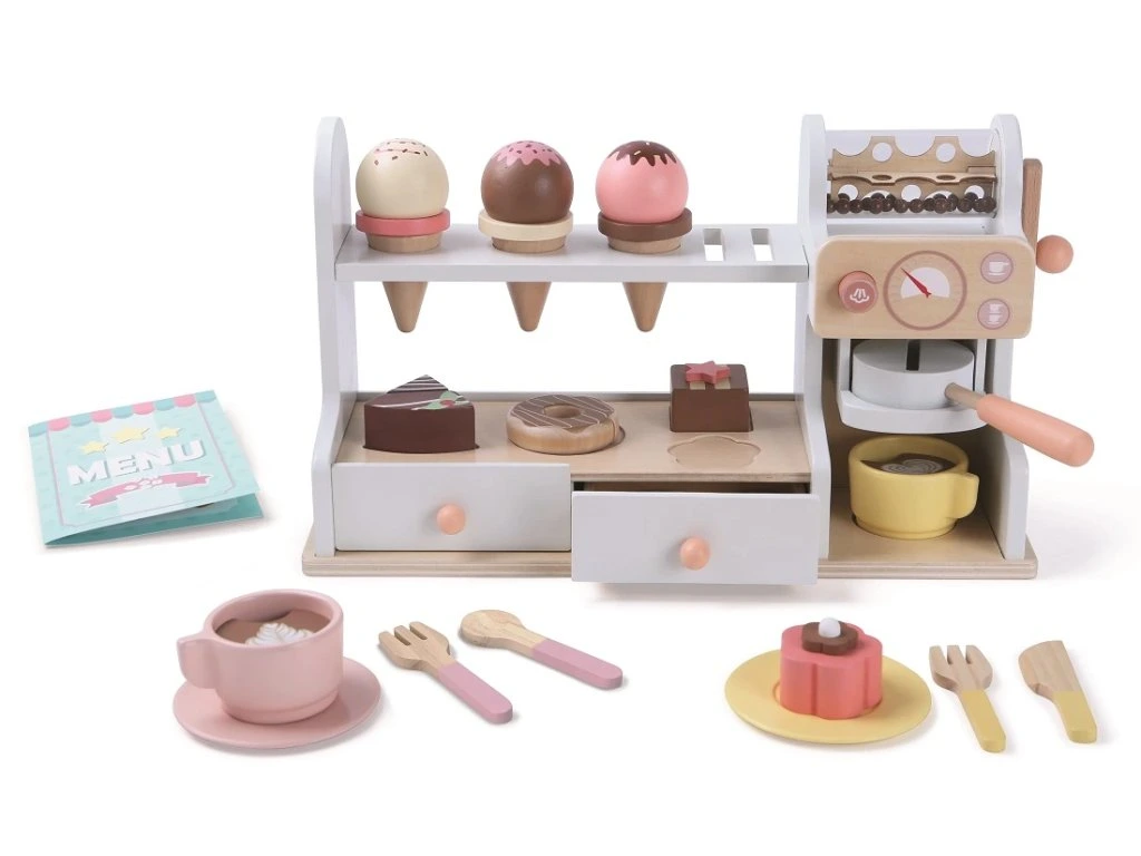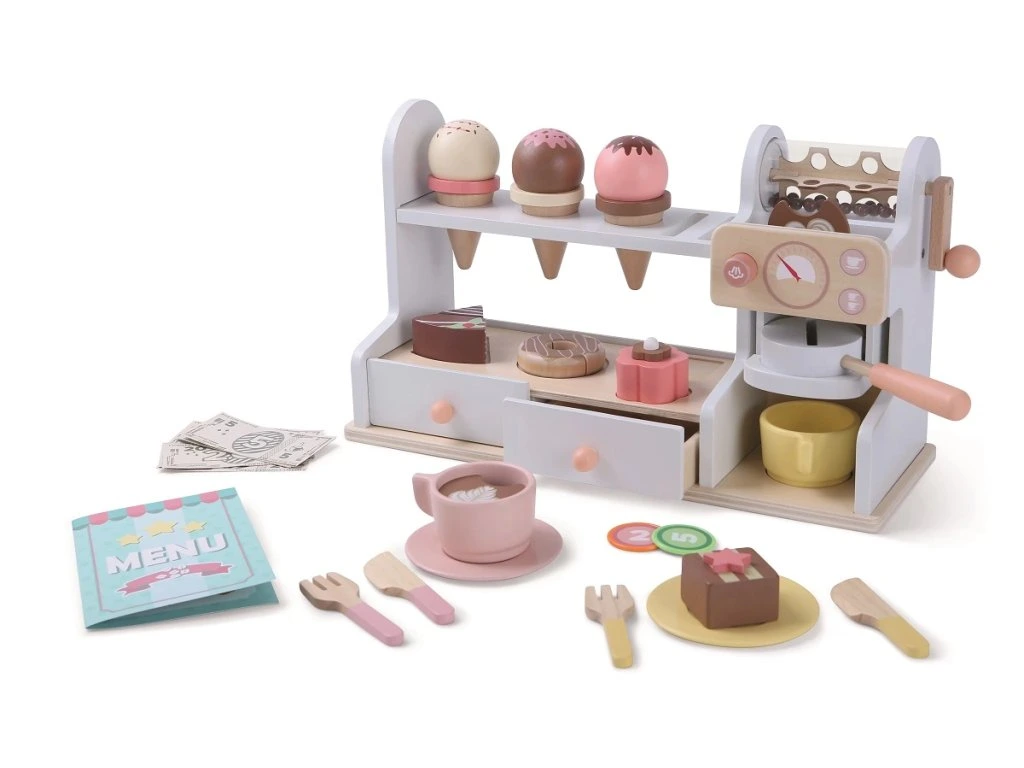 Souprava obsahuje šálky s podšálky, příbory a lžičky, pult s kávovarem, vitrínu s koláčky i poličku s otvory na zmrzlinu. Nechybí ani zásuvka s úložným prostorem na peníze, které jsou také součástí balení.