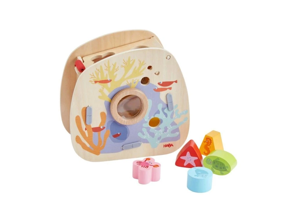 Třídící krabice – podmořský svět HABAPodívejte se dovnitř a ponořte se do barevného podmořského světa! Děti poznávají tvary a barvy pomocí pěti dřevěných kostek – každá kostka má svůj jediný správný otvor. Zkoušením a pozorováním se učí přiřazovat tvary a barvy. Malé okénko umožňuje nahlédnout dovnitř a sledovat barevný podmořský život. Klapka je snadno otvíratelná pro jednoduchou hru.