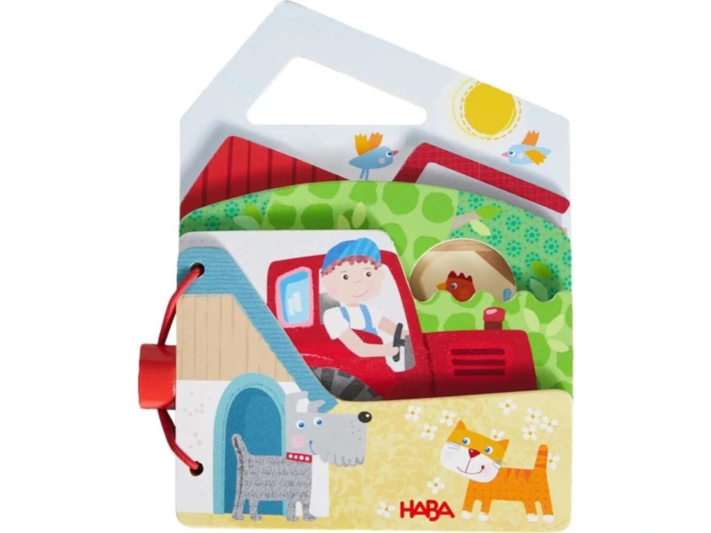 Dřevěná dětská knížka HABA – Farma a traktorPřijďte a prozkoumejte farmu s traktorem! Na 5 barevně potištěných dřevěných listech mohou děti zažít vzrušující dobrodružství s farmářem Barniem a zvířátky na farmě. Stránky jsou pevné, snadno uchopitelné a mají vyfrézovanou rukojeť na přenášení.