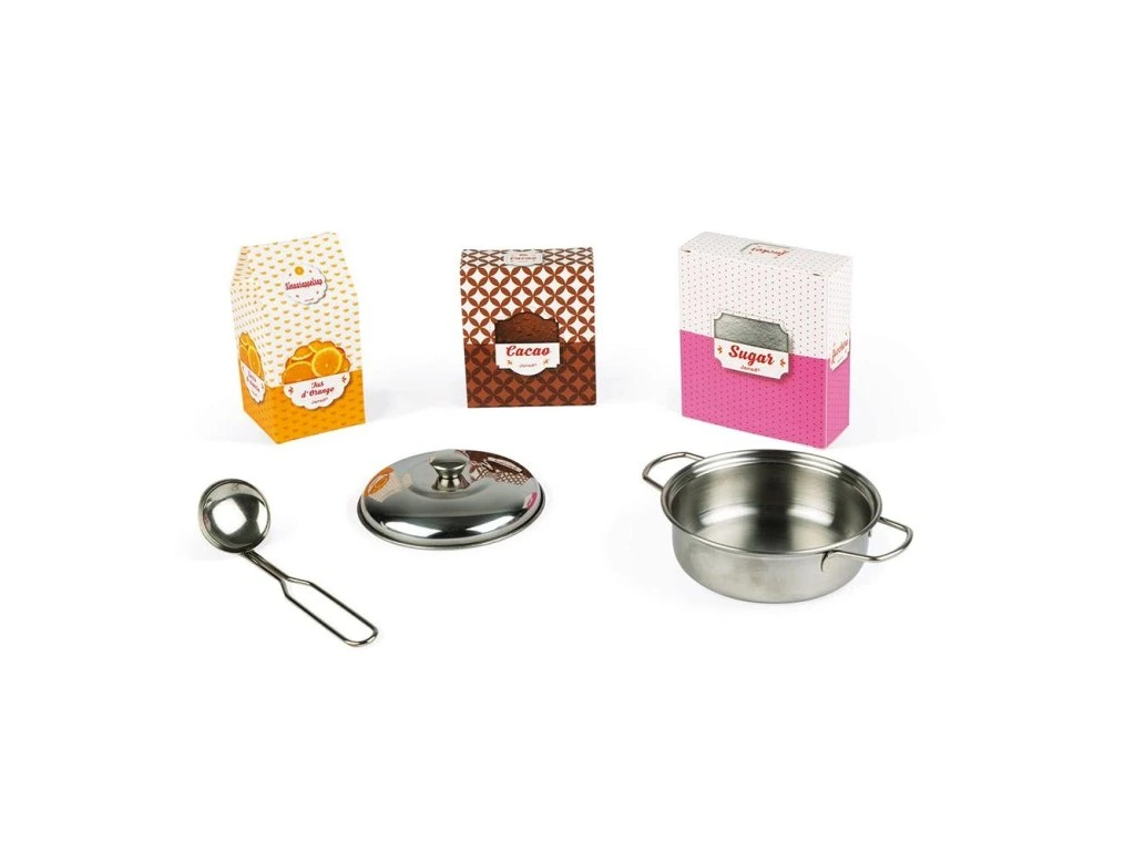 Dřevěná kuchyňka Candy Chic Janod je skvělá kuchyňka s otočnými knoflíky, které vydávají cvakající zvuk a nadčasovým designem, je vyrobená v kombinaci třpytivých barev zlaté a růžové.Připravte vynikající jídlo pro své přátele, stejně jako máma nebo táta, a staňte se malým šéfkuchařem! Dřevěná kuchyňka Candy je vyrobená ze dřeva, součástí kuchyňky je 6 doplňků, věšák na zavěšení kuchyňského náčiní, kovová lžíce, hrnec s pokličkou a 3ks potravin v kartonovém obalu (pomerančový džus, kakao, cukr).