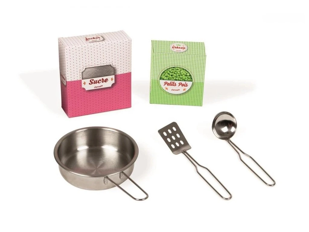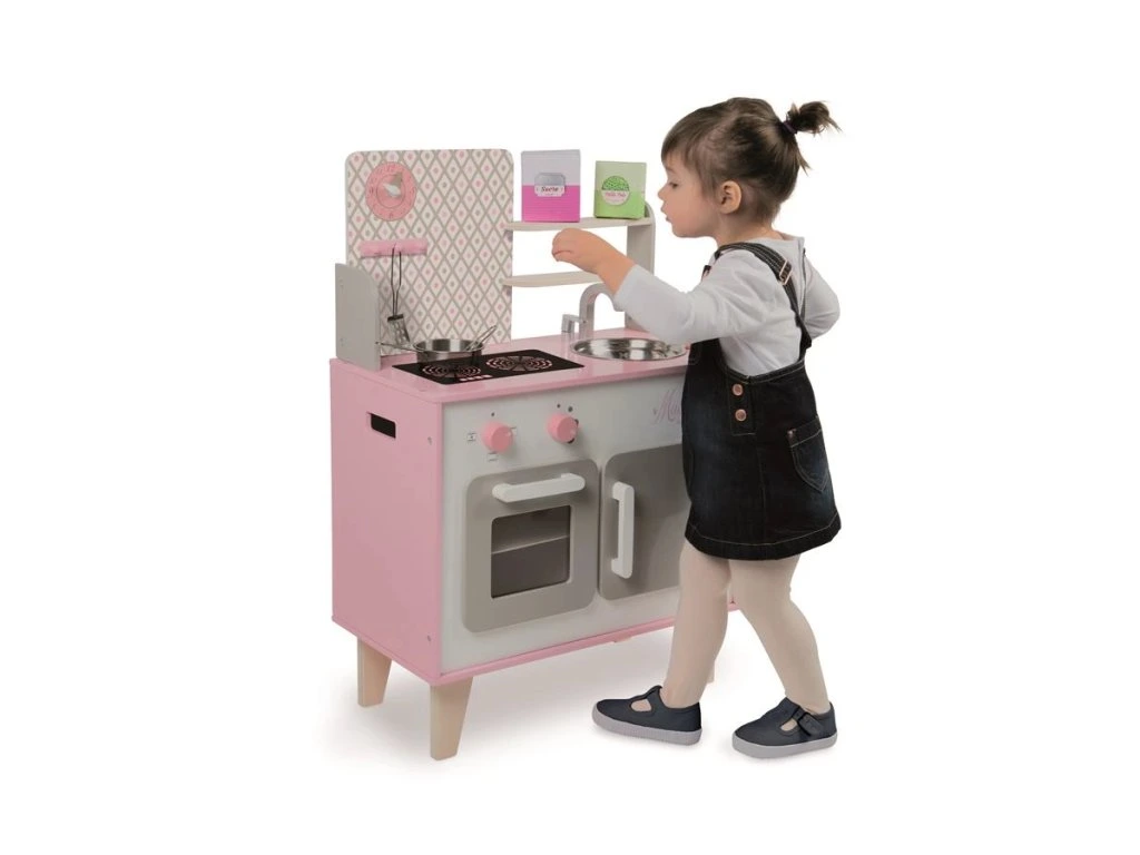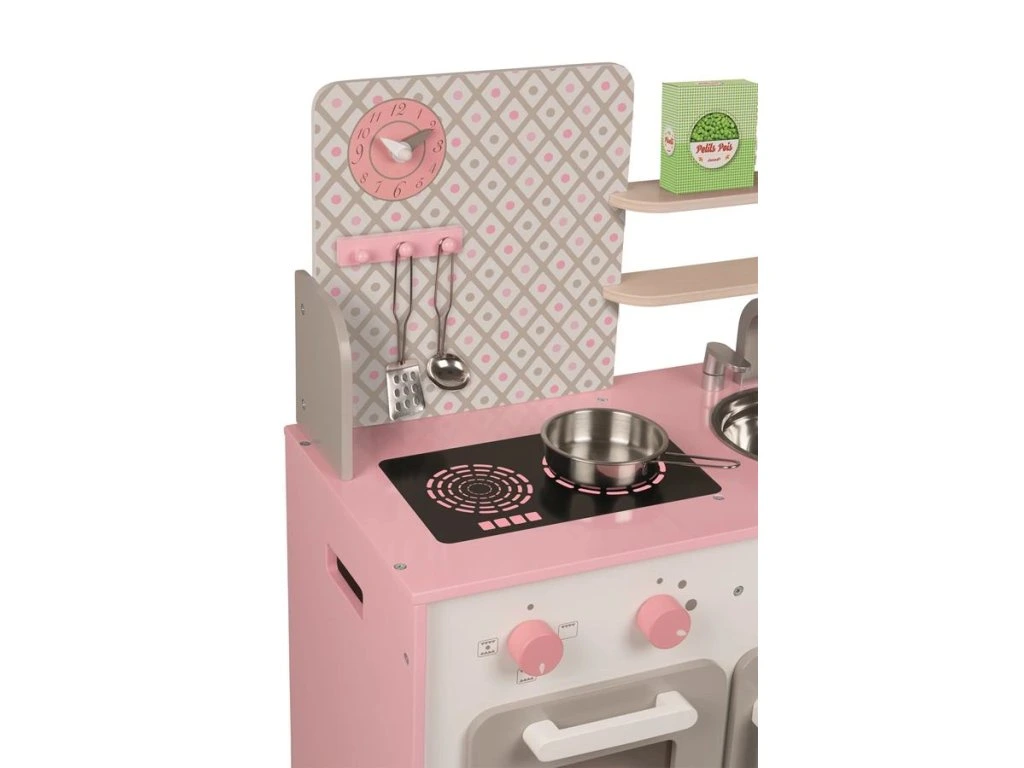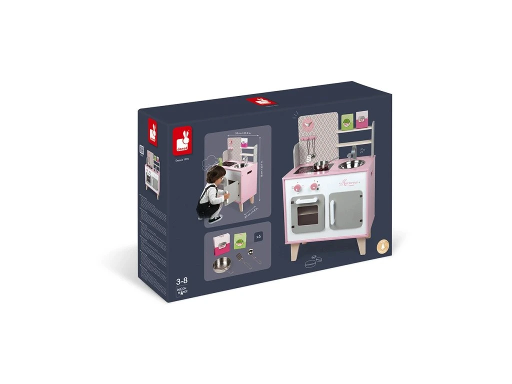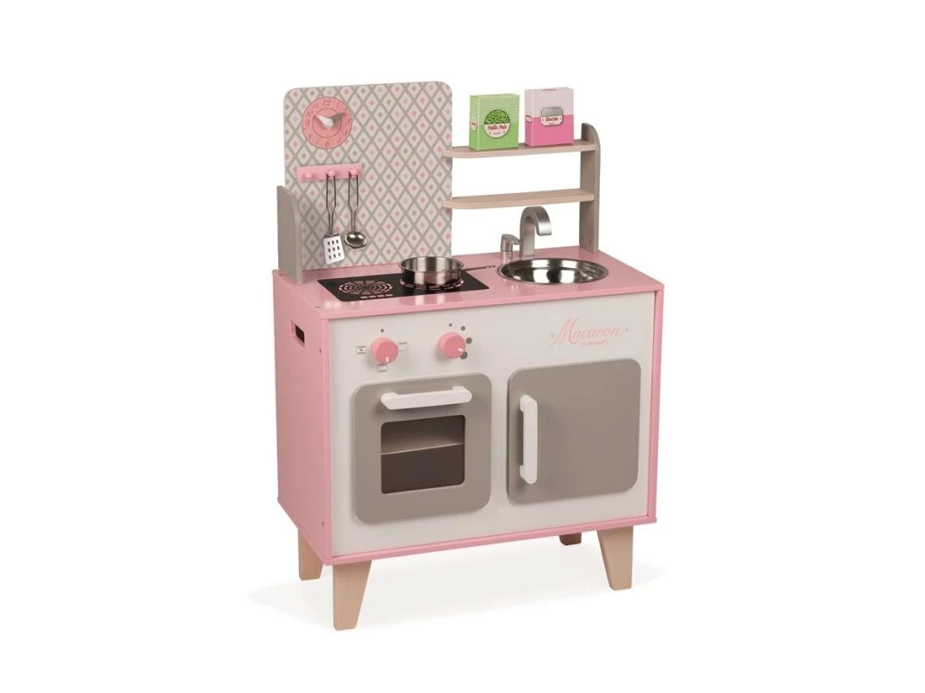 Malá dřevěná růžovo-bílá kuchyňka Macaron Janod je skvělá kuchyňka s otočnými knoflíčky a nadčasovým designem.Vestavěnou součástí kuchyňky jsou dvě poličky na odkládání potravin, hodiny, věšák na vařečky, dřez, varná deska, trouba a otvírací skříňka. Spolu s kuchyňkou najdete v balení také 5 doplňků: hrnec, naběračka, obracečka, cukr a hrášek v papírové krabičce. Trouba na pečení je realistický doplněk, který ocení každá jedna kuchařka. Praktickou součástí kuchyňky jsou poličky, které poslouží na odkládání potravin nebo na zkrášlení kuchyňky květinkami či hračkami.Dřevěná kuchyňka má dva otočné knoflíčky, které vydávají škrabající zvuk a tak se děti cítí jako ve skutečné kuchyni. Dřevěná kuchyňka pro děti v nádherné růžovo-bílé barvě je skvělým doplňkem do každého dětského pokojíčku. Malá kuchařka může vařit večeři na varné desce, péct koláček v troubě, odkládat nádobí do vestavěné skříňky a učit se tak udržovat pořádek. Na boční straně kuchyňky je otvor, díky kterému je možné kuchyňku jednoduše přenést, vzhledem k velikosti kuchyňky v pokojíčku nezabere mnoho místa. Dítě rozvíjí svou kreativitu a fantazii vymýšlením nových a nových receptů.