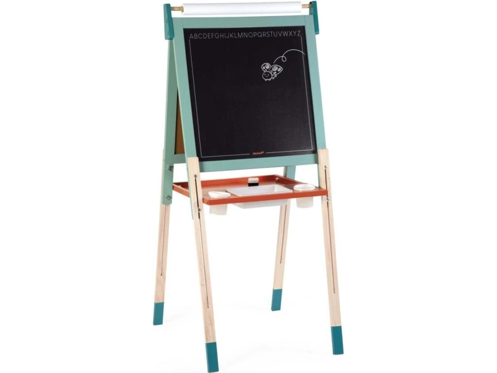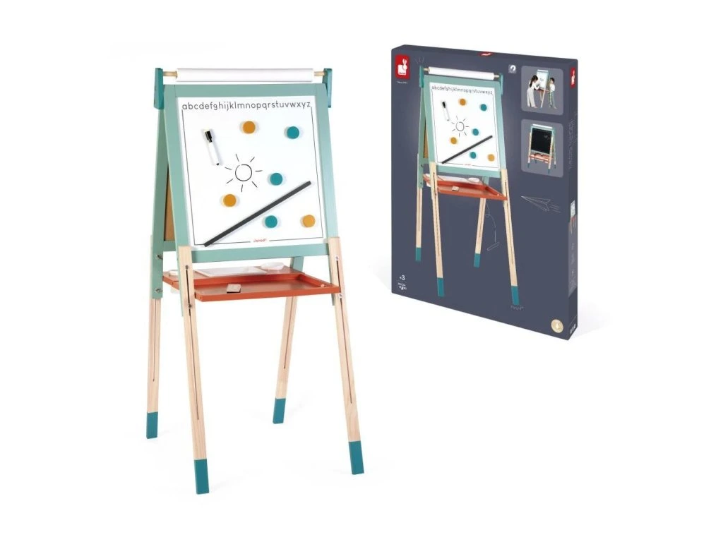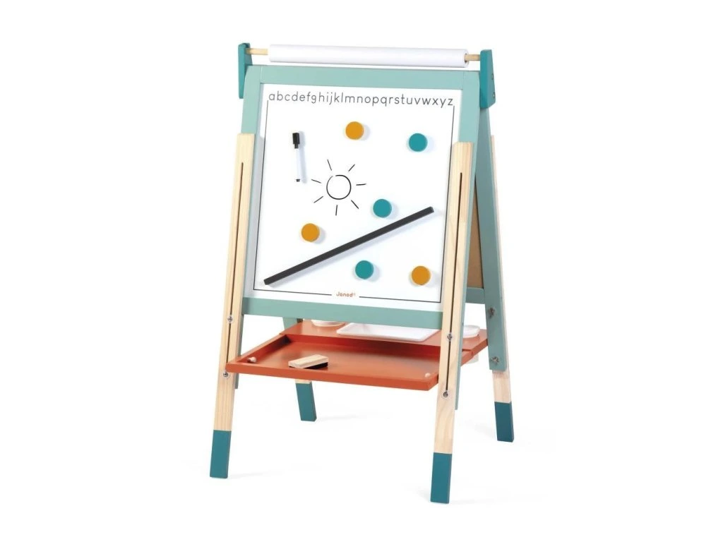 Oboustranná dřevěná tabule Janod – bílá magnetická & černá na kříduOboustranná dřevěná tabule Janod je ideálním nástrojem na kreativní učení a zábavu. Nabízí magnetickou bílou stranu na psaní fixem a černou tabulovou stranu na kreslení křídou. Díky polohovatelné konstrukci se dá výška tabule přizpůsobit potřebám dítěte. Moderní mentolový design skvěle zapadne do každého dětského pokoje.