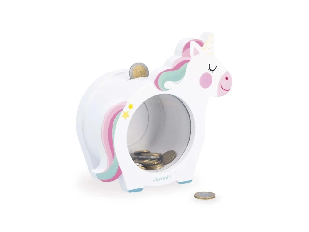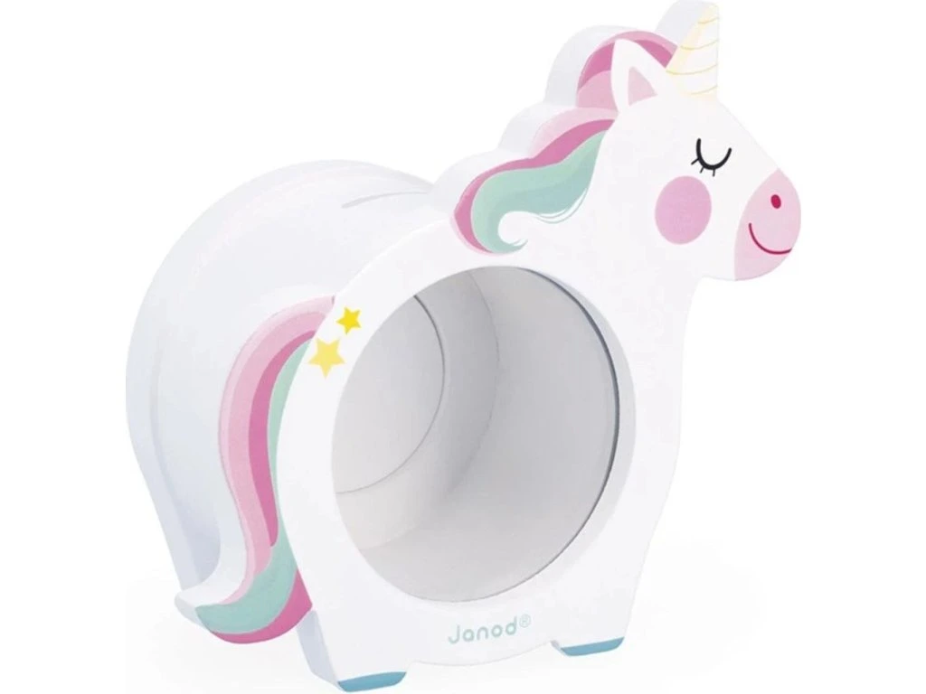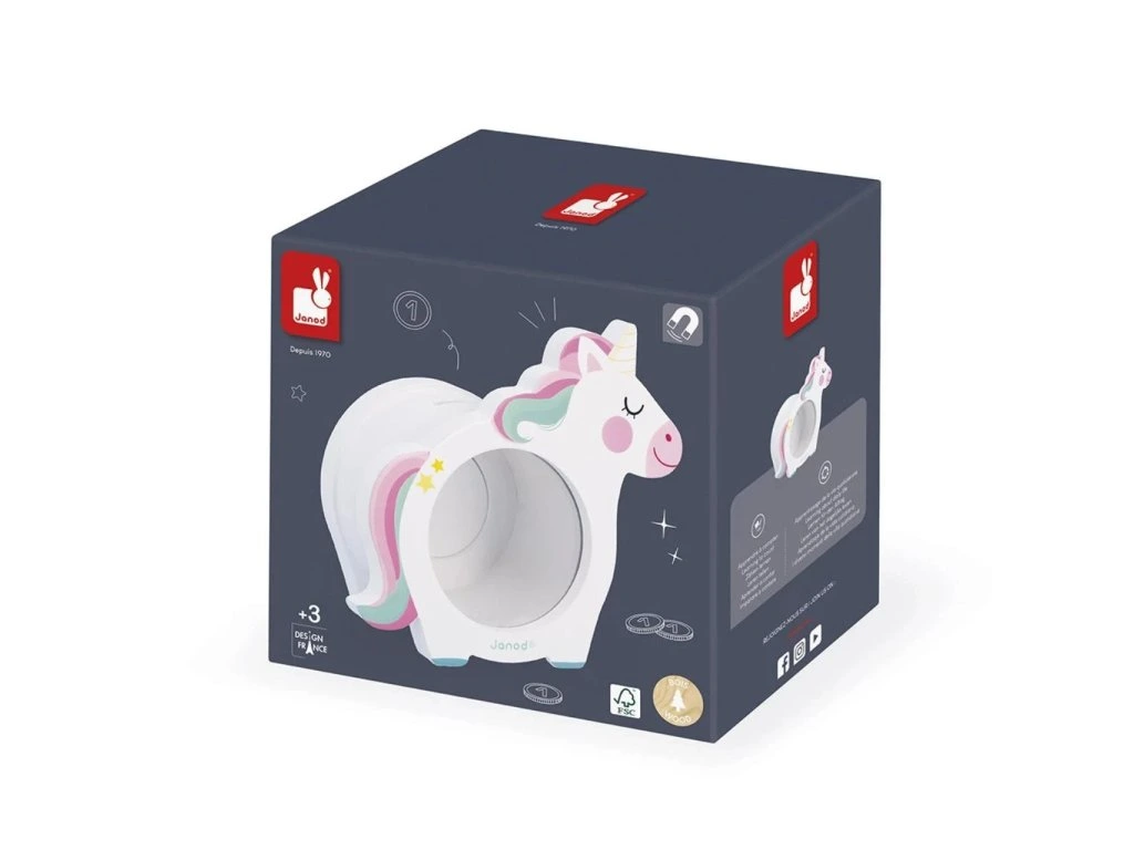 Pokladnička Janod – jednorožecObjevte roztomilou dřevěnou pokladničku Janod ve tvaru jednorožce! Tato praktická a dekorativní pokladnička umožňuje dětem bezpečně ukládat mince a bankovky. Díky průhlednému okénku na přední straně mohou sledovat své úspory a magnetický otvor na zadní straně umožňuje snadné vybírání peněz.