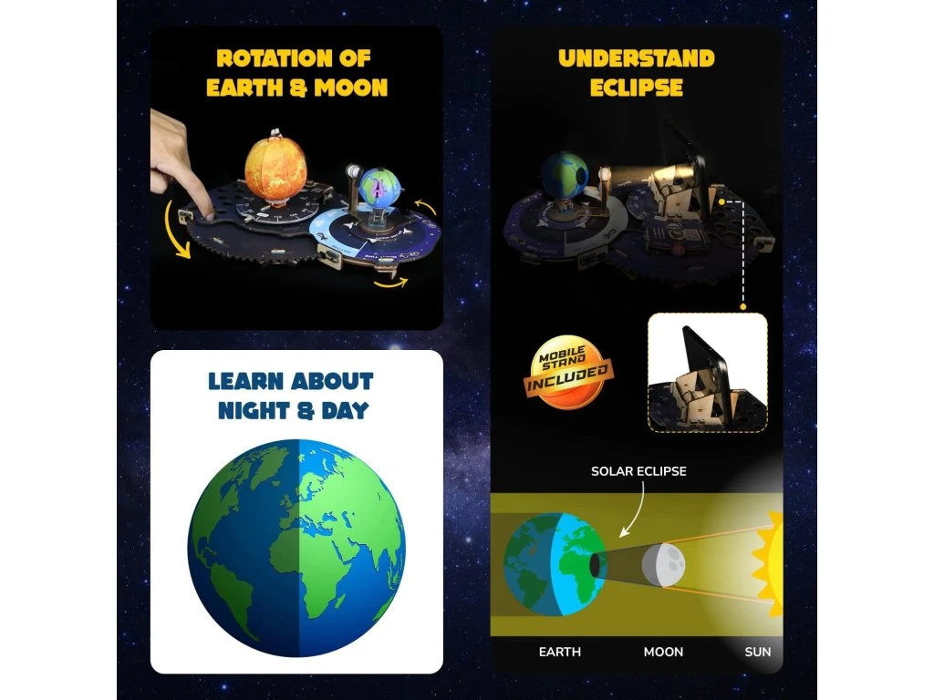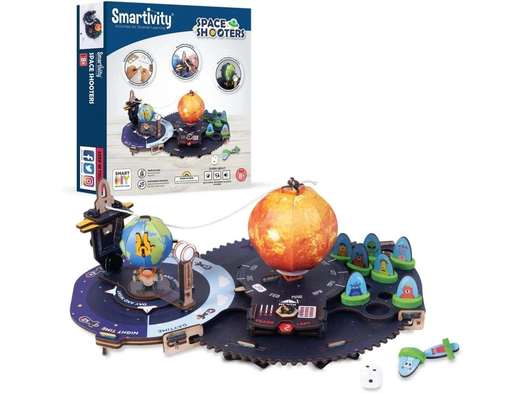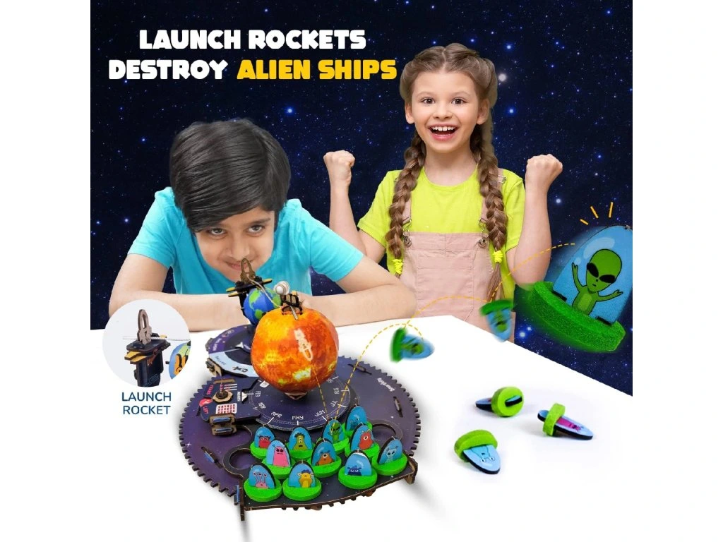 Pomozte svému malému astronautovi s obranou proti nepřátelským mimozemšťanům a zachraňte sluneční soustavu pomocí vlastních vesmírných střelců. Tato jedinečná dřevěná stavebnice, kterou si dítě musí postavit samo, spojuje vzrušení ze střelby s poznáním principů střídání noci a dne, zatmění a planetárních pohybů.
