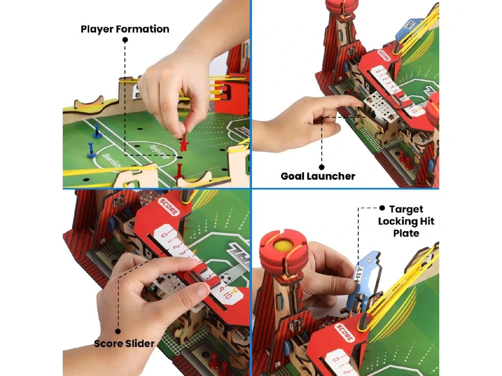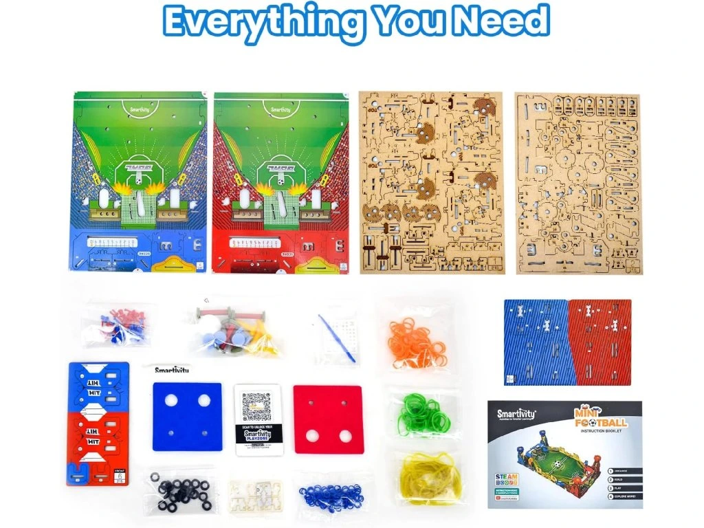Smartivity – Mini fotbal je kreativní dřevěná stavebnice, která v sobě spojuje stavění, logické myšlení a dynamickou stolní hru. Děti si nejprve samy sestaví vlastní mini fotbalové hřiště a následně si ho mohou naplno užít jako zábavnou společenskou hru pro více hráčů.