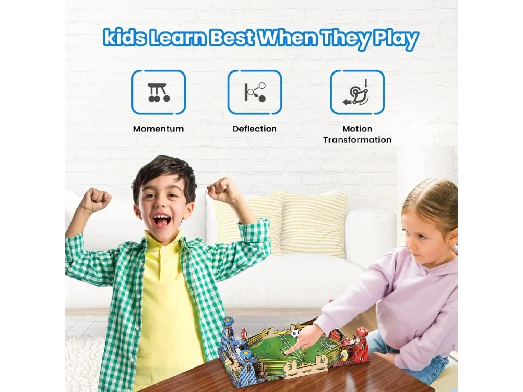 Celý herní mechanismus je založený na čistě mechanickém principu – bez elektroniky, baterií či lepidla. Během stavění i hraní děti přirozeně objevují, jak funguje pohyb, rychlost, odraz a přesnost, čímž si nenápadně osvojují základní fyzikální zákonitosti.