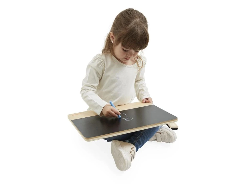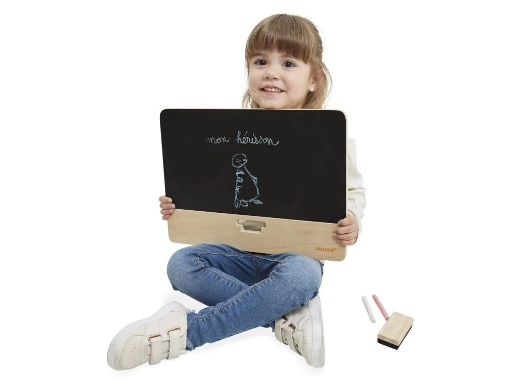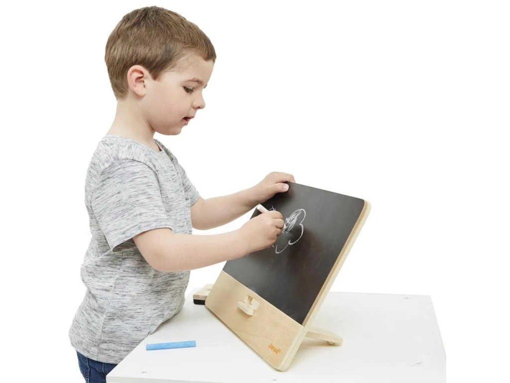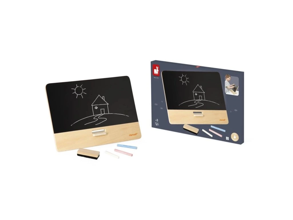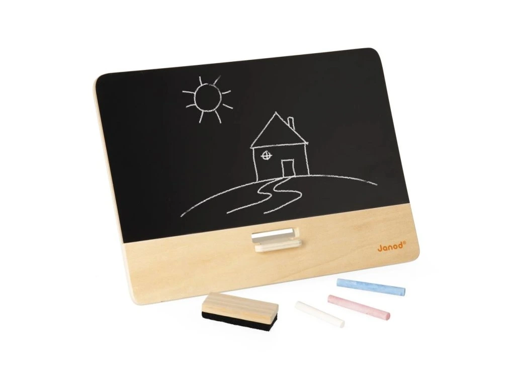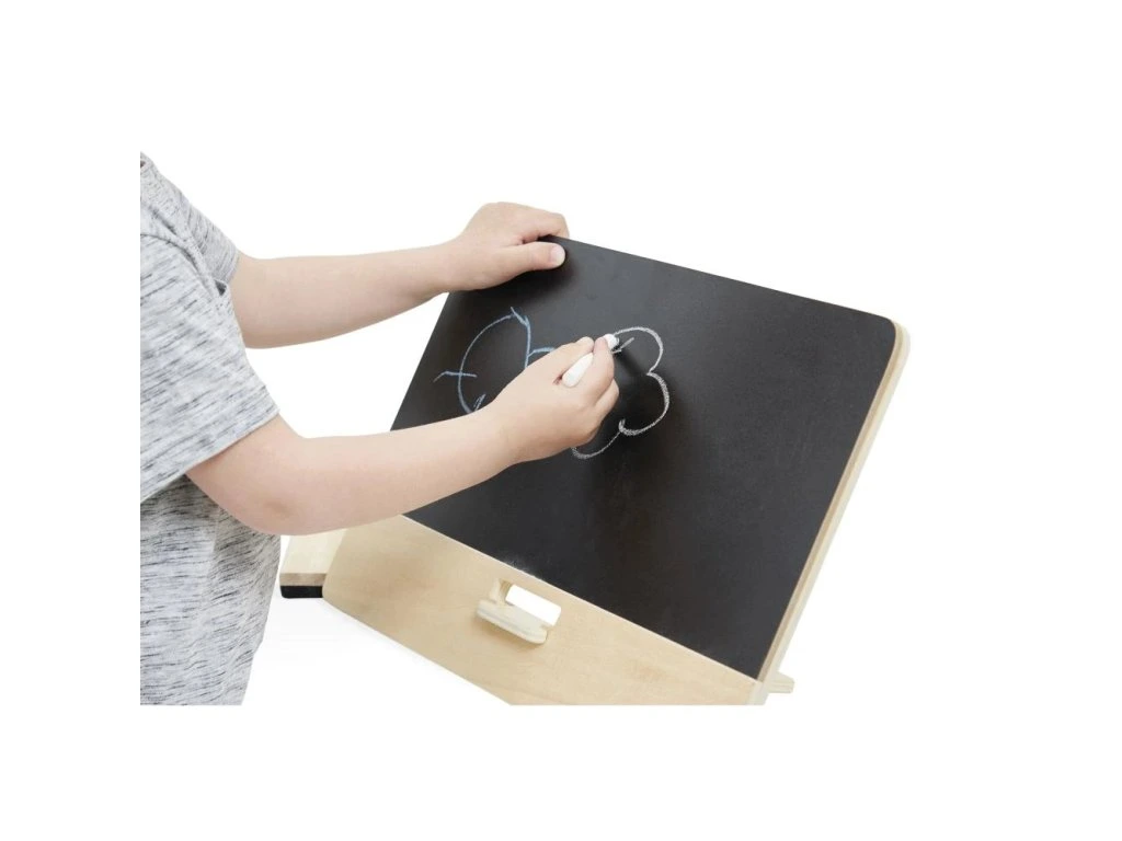 Vezměte si křídu, umělci! Nechte ožít fantazii vašeho dítěte na této krásné dřevěné tabuli.Se stojánkem na zadní straně a silikonovými podložkami pro větší stabilitu se tato tabule snadno umístí na stůl nebo jiný rovný povrch. Skladování a přeprava nemohou být jednodušší! Stojánek se ukládá sklopením za desku uvolněním západky na zadní straně. S tabulí jsou dodávány 3 kusy křídy a houbička.