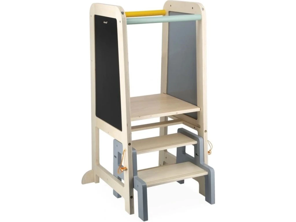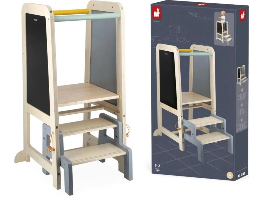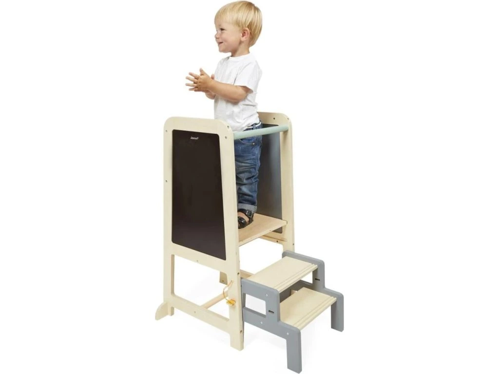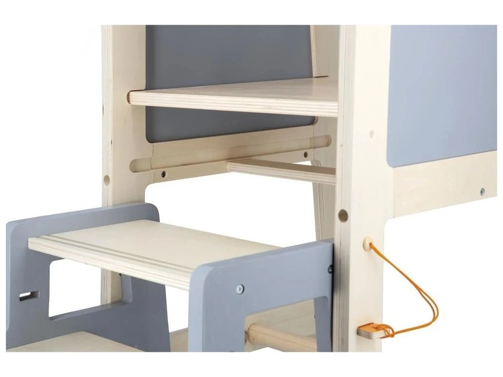 Věž roste společně s dítětem díky 2 nastavitelným výškovým úrovním (od 32,5 do 40,5 cm). Praktická odnímatelná stolička slouží jako schůdek pro jednoduchý a bezpečný výstup. Dá se pevně připevnit k věži pro vyšší stabilitu nebo používat samostatně po celém domě.