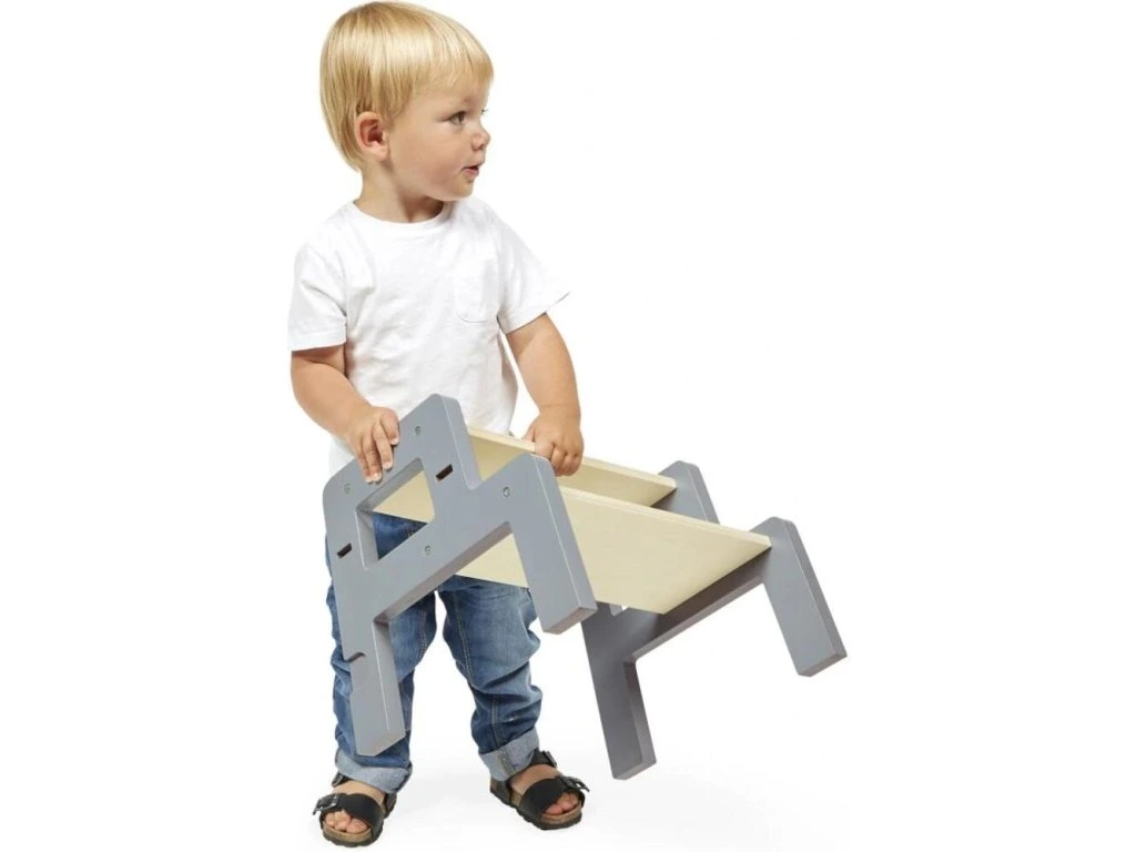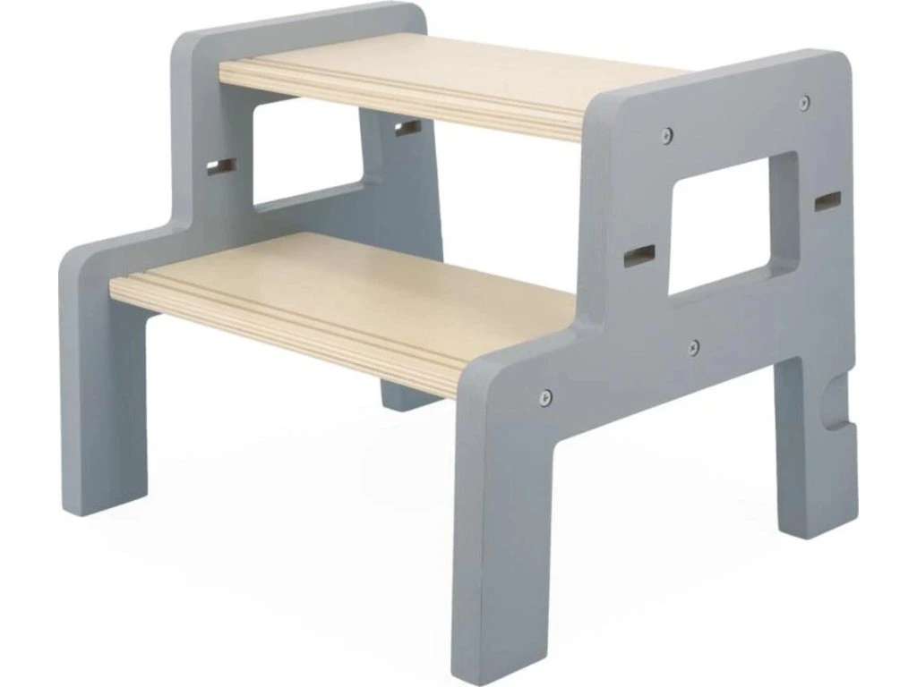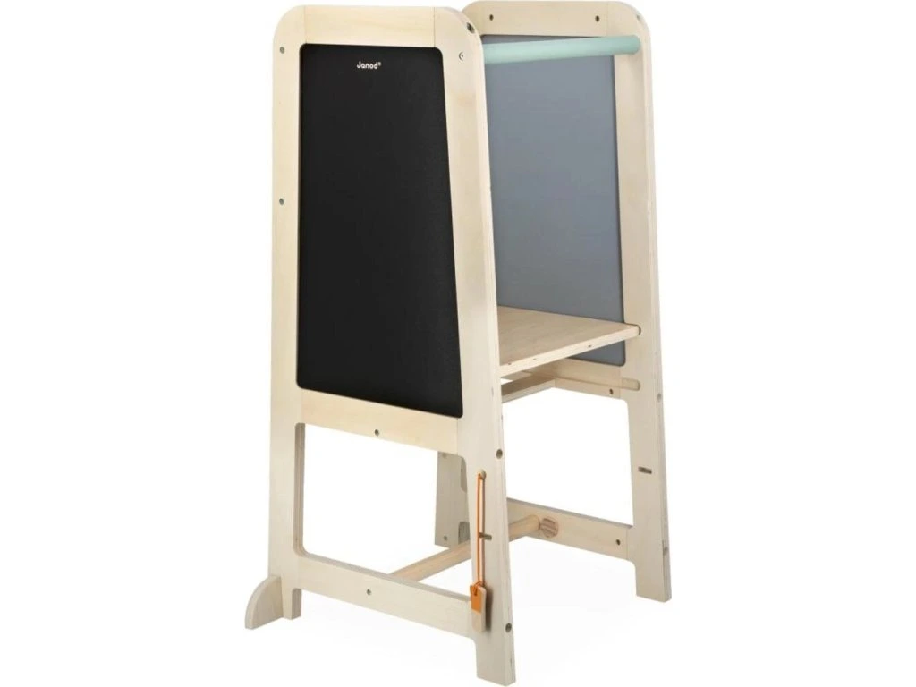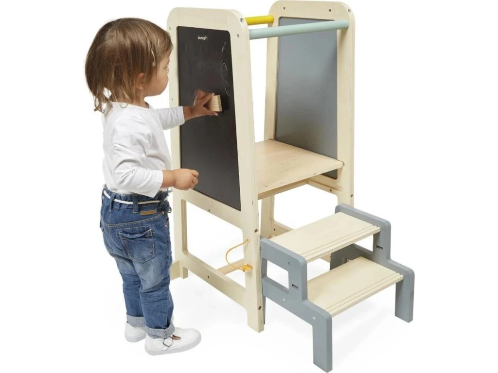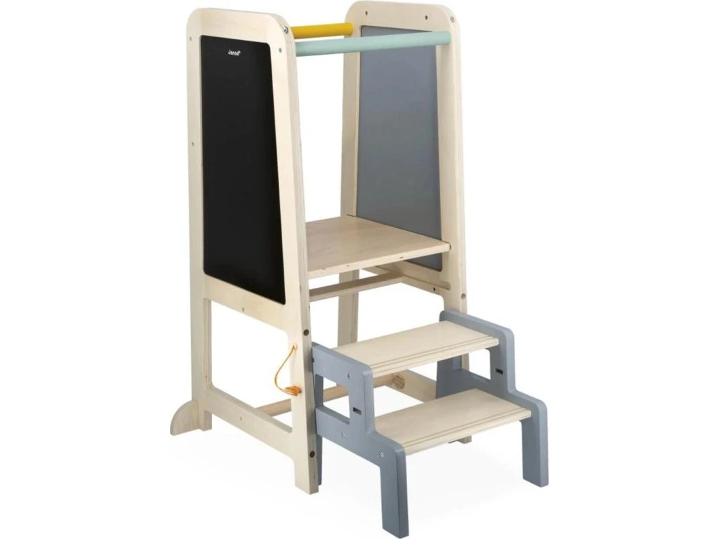 Věž roste společně s dítětem díky 2 nastavitelným výškovým úrovním (od 32,5 do 40,5 cm). Praktická odnímatelná stolička slouží jako schůdek pro jednoduchý a bezpečný výstup. Dá se pevně připevnit k věži pro vyšší stabilitu nebo používat samostatně po celém domě.