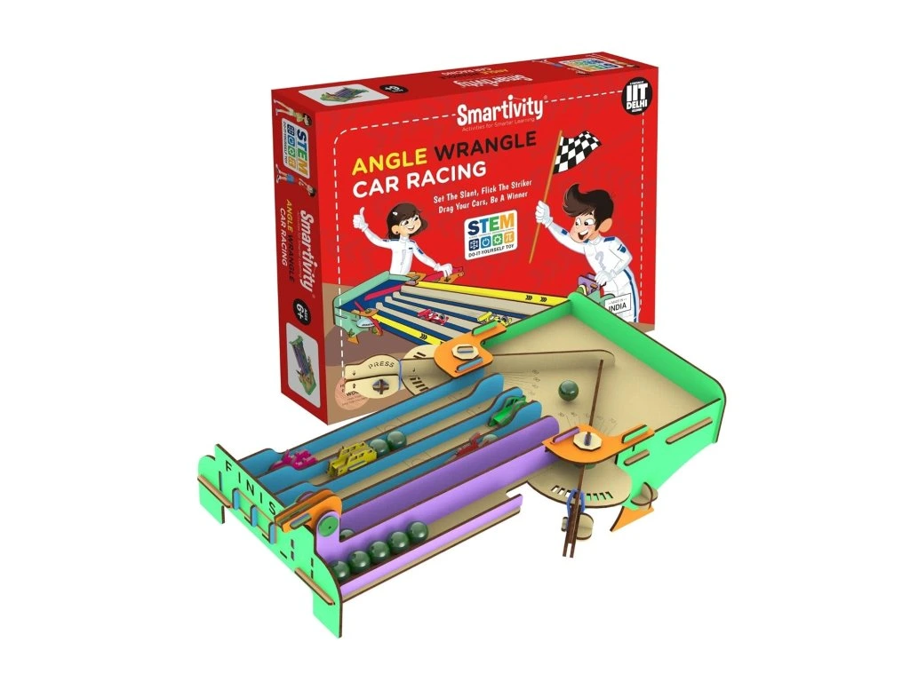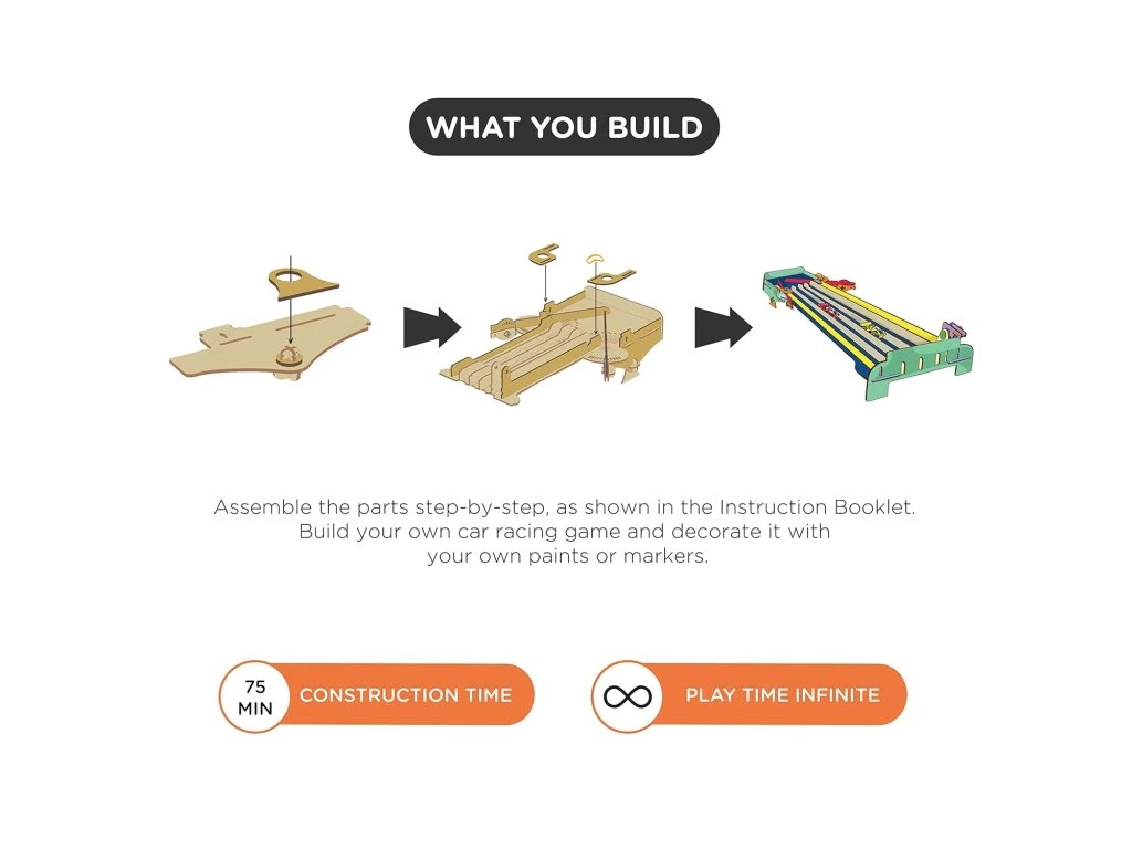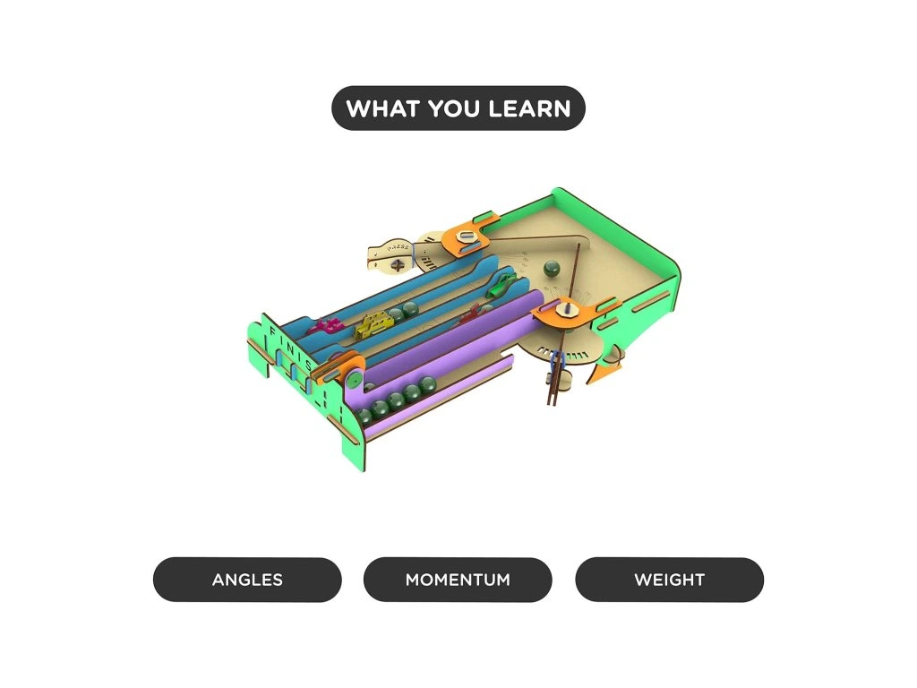 Vyzkoušejte dřevěnou závodní dráhu, po které se auta pohybují jen na základě vhodně zvoleného úhlu a síly výstřelu. Dráhu je potřeba nejprve sestavit. Cílem hry je zvolit úhel odrazových mantinelů tak, aby kulička udeřila do toho správného auta.