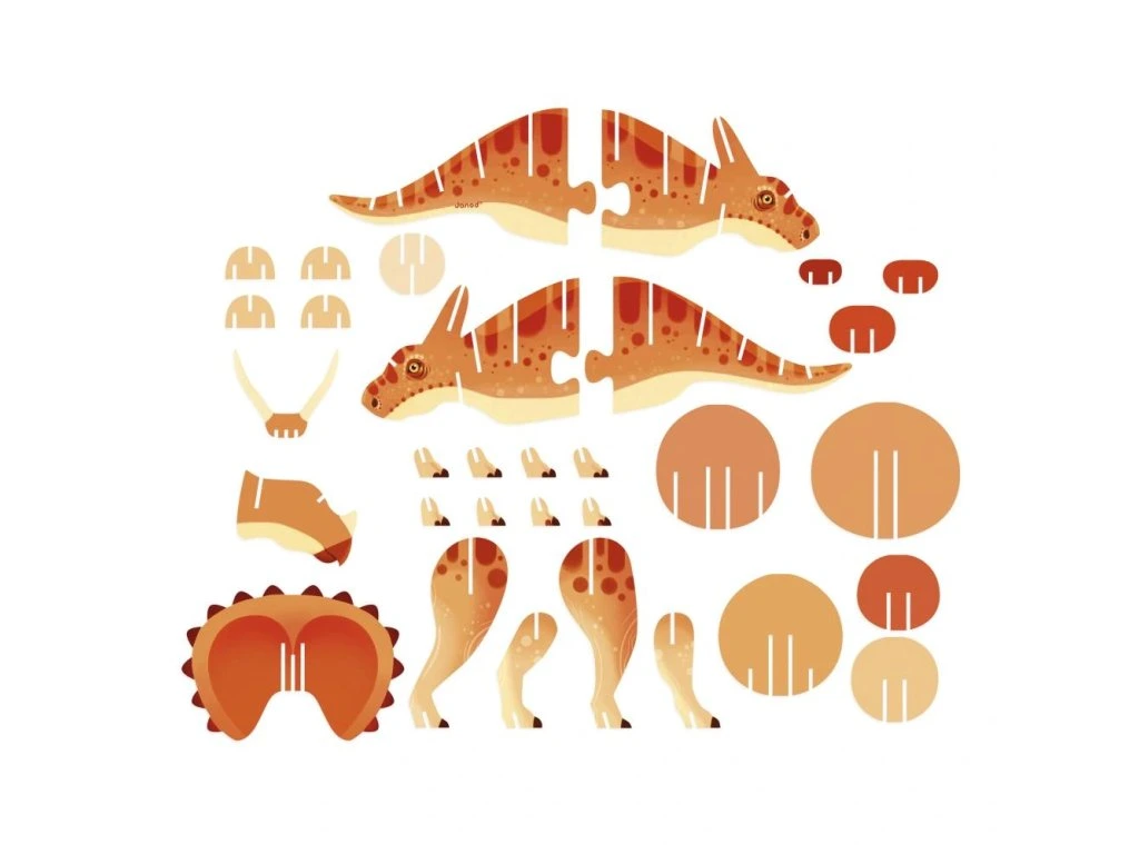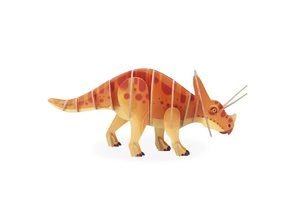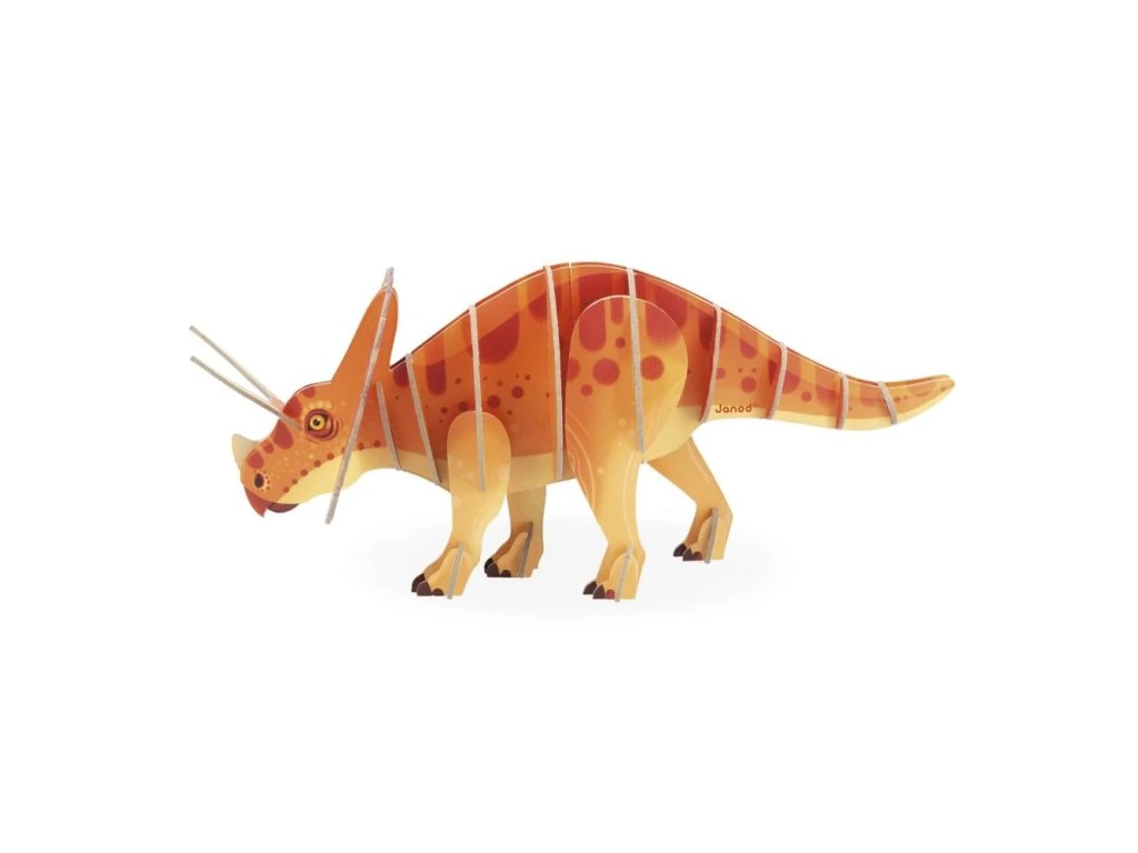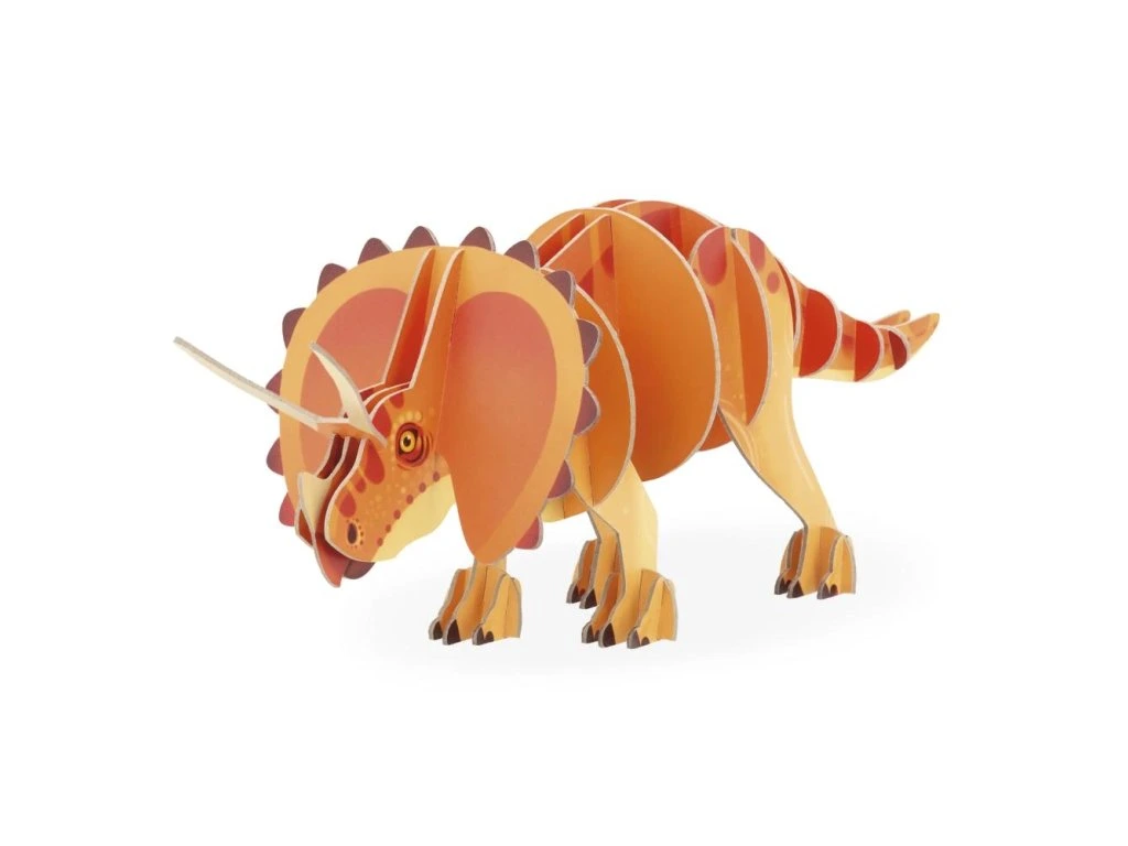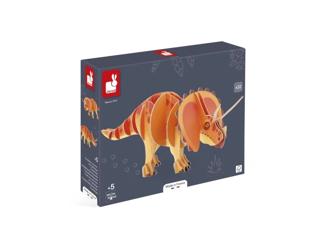 Se svým velkým límcem a 3 působivými rohy je Triceratops jedním z nejznámějších dinosaurů. Tyto 32dílné 3D puzzle, které jsou vytištěné po obou stranách, vracejí tomuto slavnému dinosaurovi jeho majestátnost a to v plné nádheře. Montážní návod je součástí balení, díky čemuž se dají lehce postavit.Puzzle vyrobené ve Francii s použitím kartonu FSC™ a barev na rostlinné bázi.