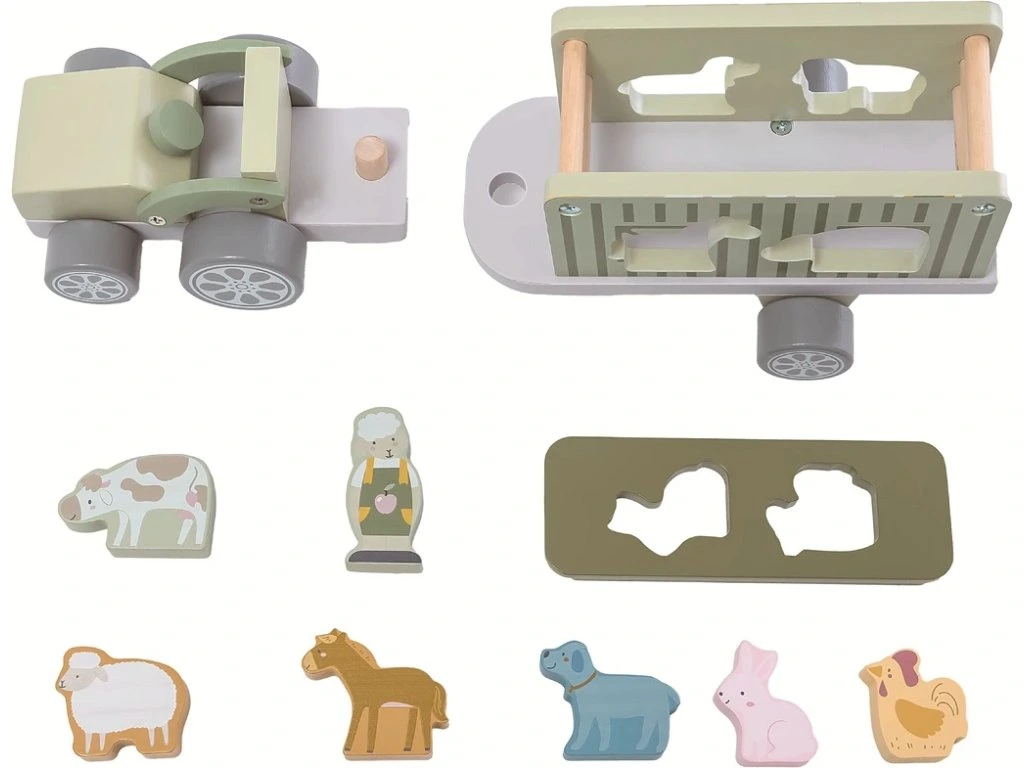 Vlečku je možné odpojit od autíčka a střechu jednoduše složit. Na bocích i na vrchu se nachází otvory na vkládání dřevěných zvířátek. Každé z nich má svůj tvar i místo, takže si děti přirozeně procvičují jemnou motoriku, logické myšlení i trpělivost.
