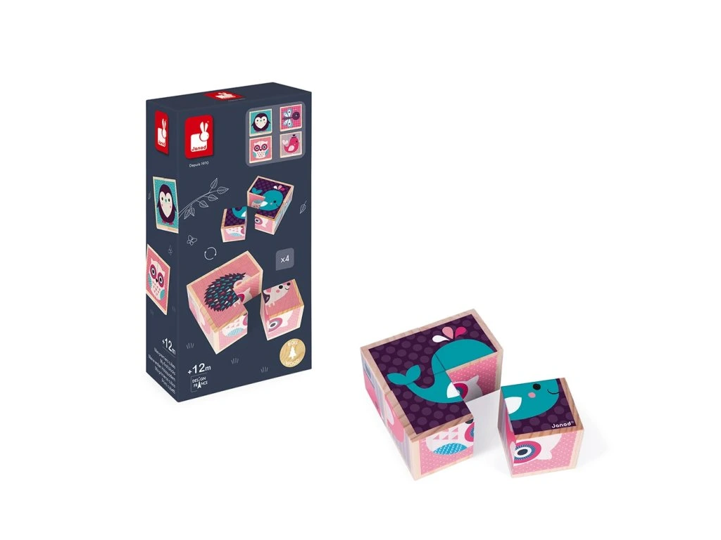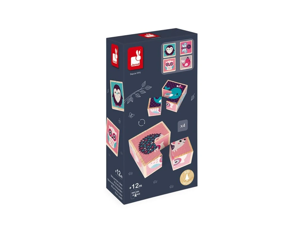 Moje první kostky - Mláďata je zábavná hra ze 4 dřevěných kostek, ze kterých si můžete vytvořit 4 portréty mláďat různých zvířátek. Dokážete je z jednotlivých kostek poskládat? Kostky jsou skvělým prvním narozeninovým dárkem pro vaše nejmenší ratolesti! Kostky jsou dodávány v originálním a praktickém kartonovém obalu.Vhodné pro děti od 12 do 36 měsíců.