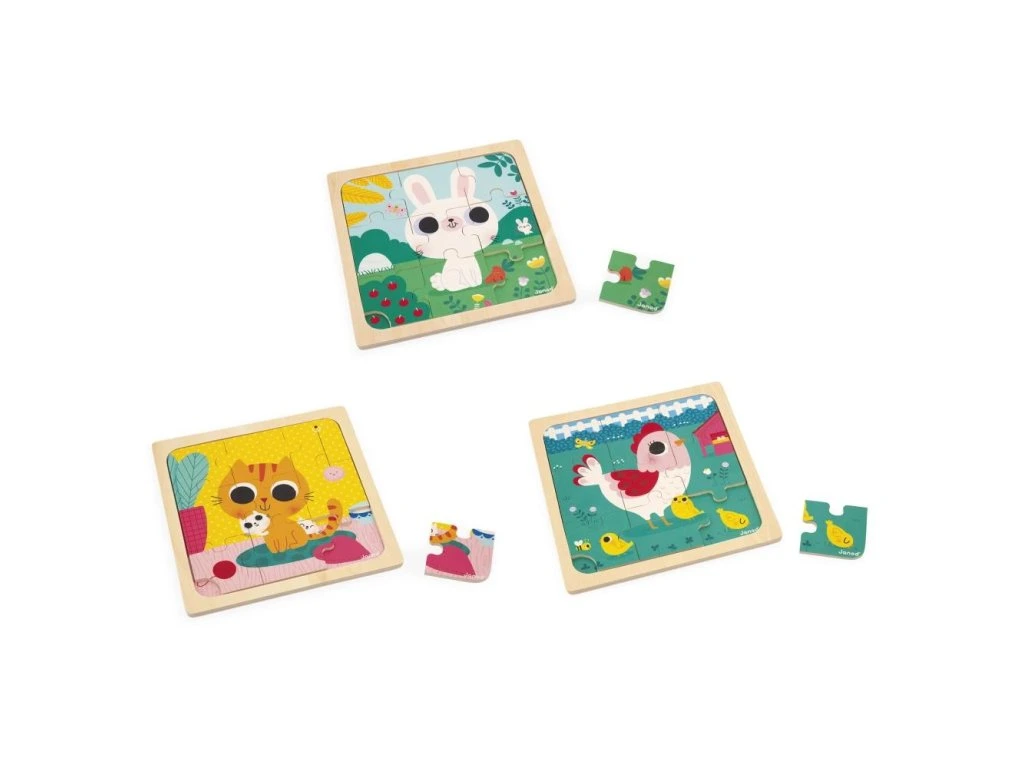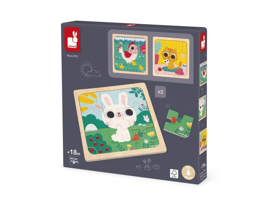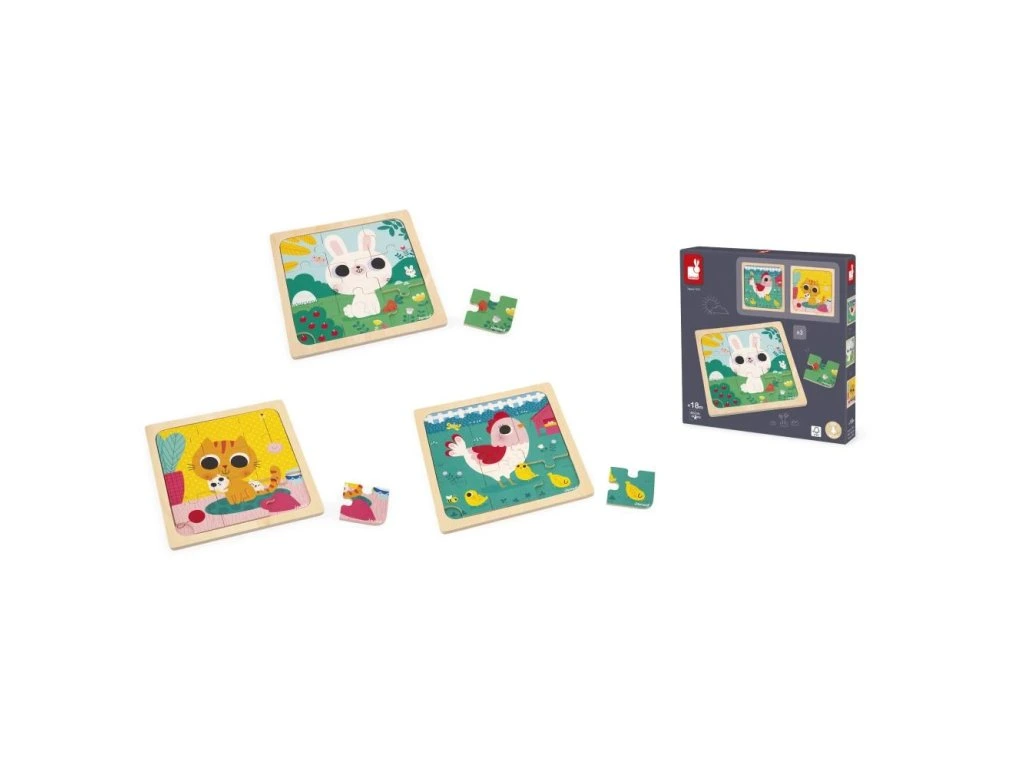 - Různé motivy: Tato sada obsahuje troje puzzle s různými motivy - kočka Oříšek, králík živící se mrkví a roztomilá slepička Henrietta. Tyto rozmanité motivy umožňují dětem objevovat a učit se o různých zvířátkách.