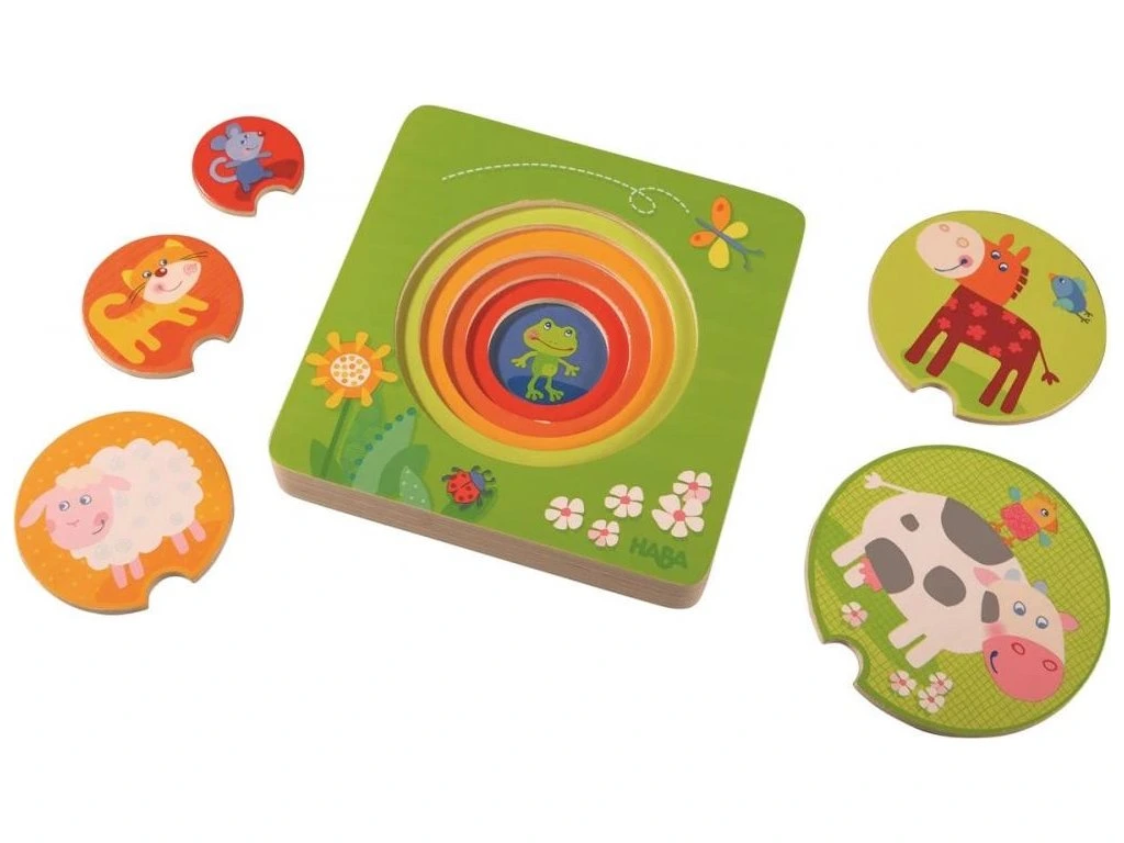 Na farmě se neustále něco děje. Objevujte toto fascinující prostředí pomocí dřevěné skládačky, která hravou formou naučí rozpoznávat barvy, přiřazovat a hledat dílky, které k sobě velikostí a tvarem pasují. Puzzle pro nejmenší německé značky Haba se skládá z trojrozměrné hrací plochy a pěti dřevěných disků. Skládačka Na farmě je výborná hra na trénink jemných motorických schopností.Vhodné pro děti: od 1 roku