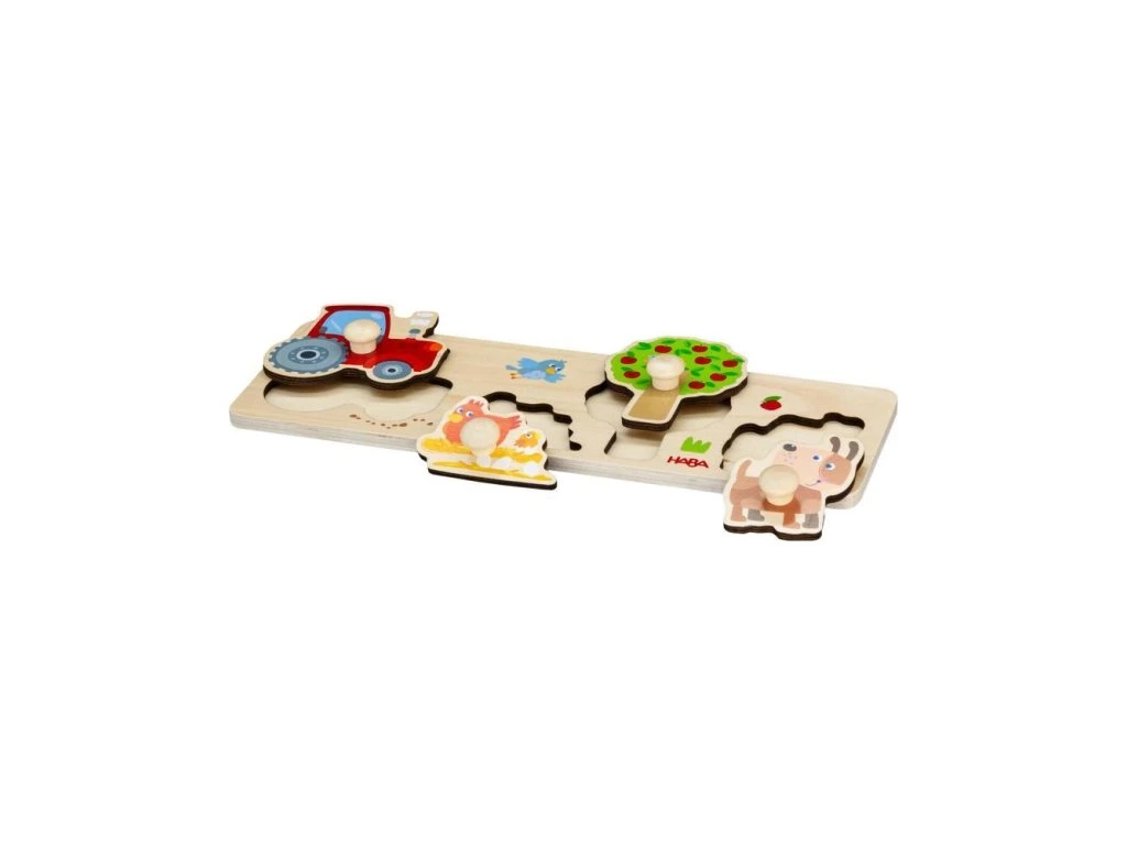 Každý dílek má své místo. Podaří se malým objevitelům správně přiřadit traktor, jabloň a další motivy a uložit je do správného výklenku? Toto první puzzle je ideální pro děti, které se učí rozpoznávat tvary a souvislosti.
