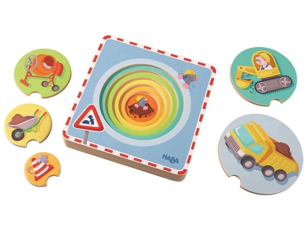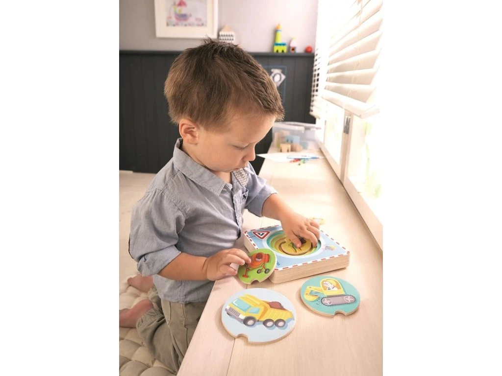 Co se děje na staveništi? S našimi dřevěnými skládačkami objeví vaše dítě tyto fascinující aktivity a naučí se rozlišovat velikosti a barvy. Kusy dílků jsou namontované v zářezech podle rozměrů.Vhodné pro děti: od 1 roku