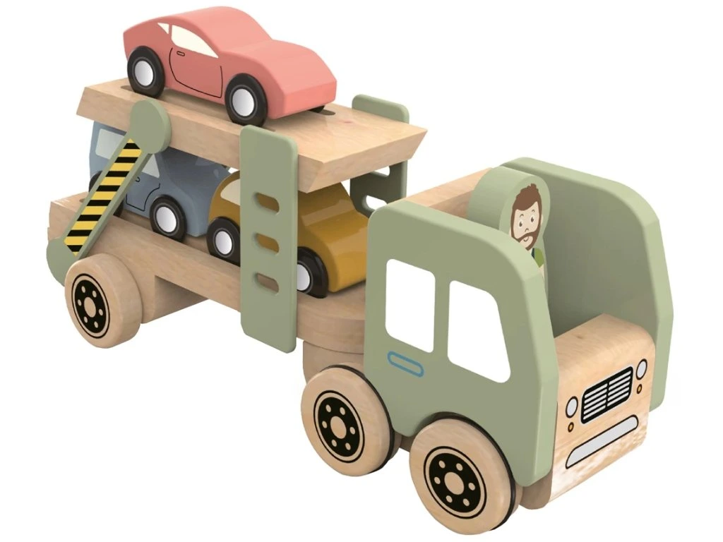Naložte autíčka, posaďte řidiče za volant a vyražte na cestu za dobrodružstvím! Dřevěný přepravník se třemi autíčky a figurkou řidiče potěší všechny malé milovníky aut.