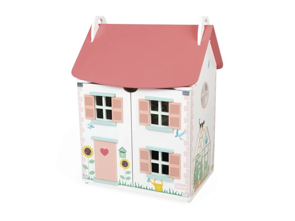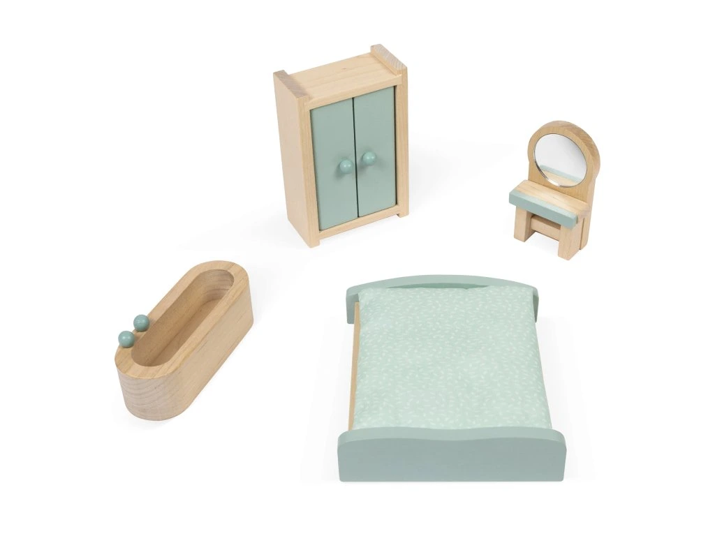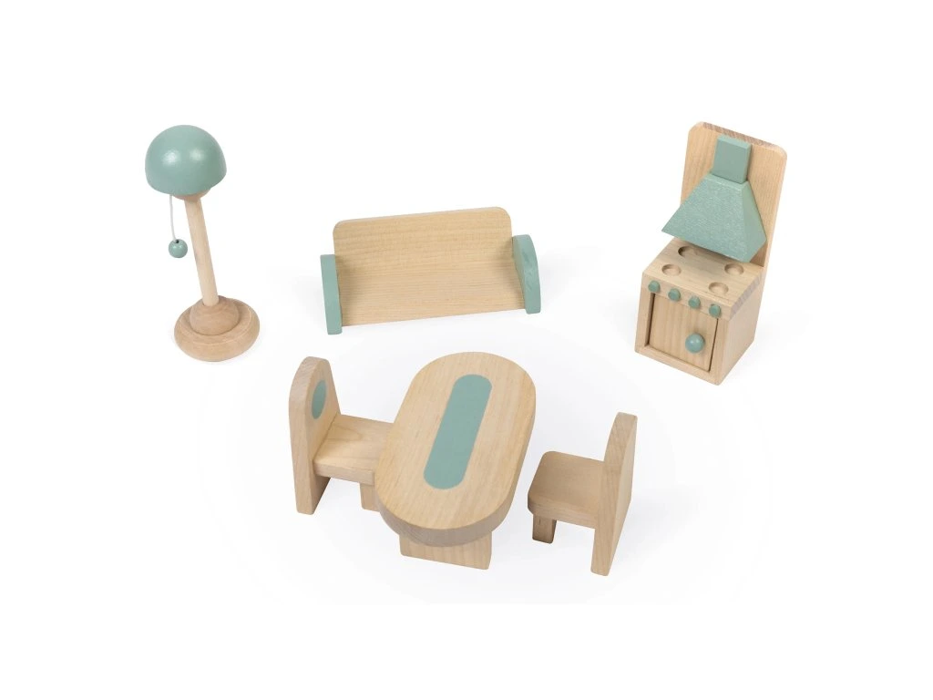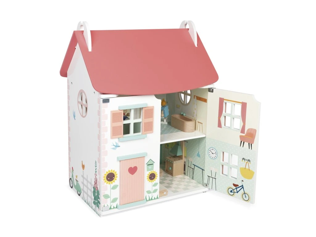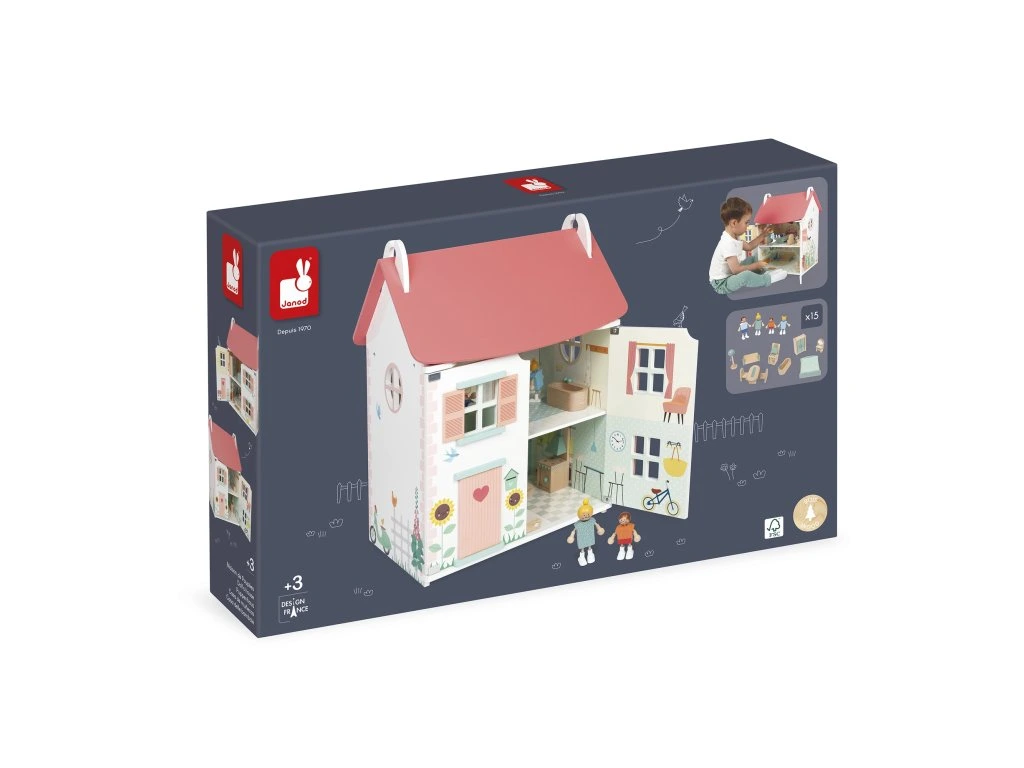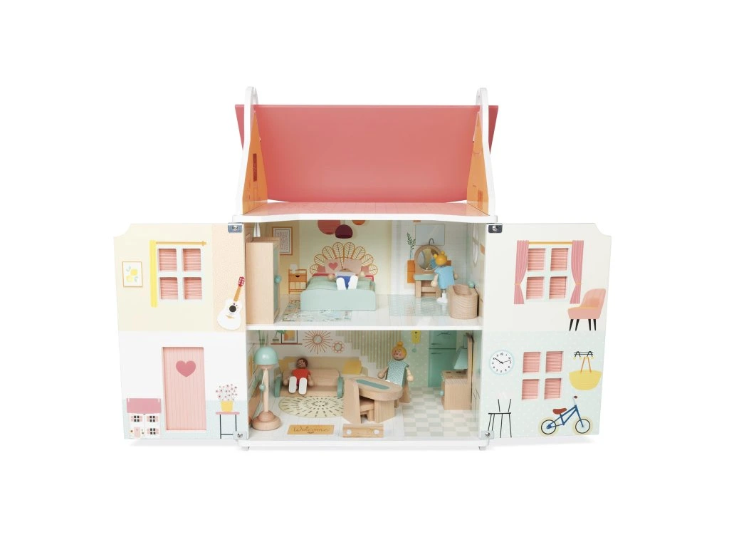 Stačí otevřít dveře a objevit jednotlivé místnosti – obývák, jídelnu či ložnici. Nábytek si děti mohou uspořádat podle vlastní fantazie a oživit 4 roztomilé dřevěné postavičky. Po hře se domeček jednoduše zavře, takže je praktický i na skladování.