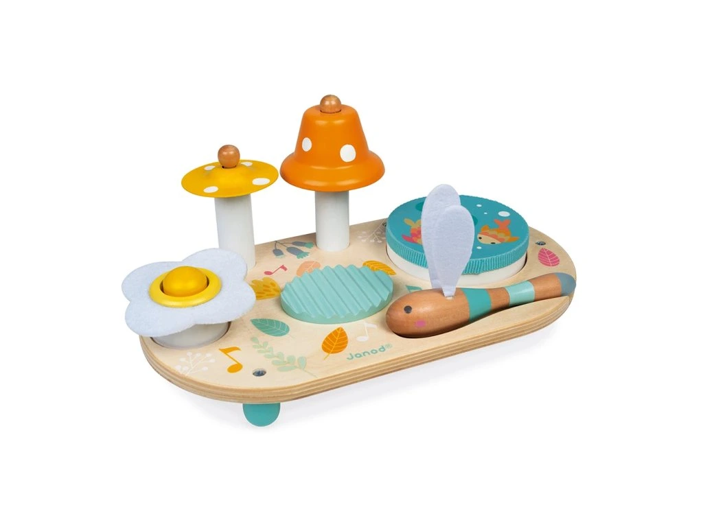 Dřevěný hudební stolek pro děti Janod série Pure. Nádherný barevný hudební stolek pro nejmenší hudebníky. Hudební set obsahuje zvoneček, bubínek/tamburínu, činely, chrastítko, dřevěnou paličku. Nástroje podporují rozvoj hudebního cítění a smyslu pro rytmus vašich ratolestí. Pastelový dřevěný stolek je vhodný na rozvíjení hudebního talentu vašeho dítěte a je originálním dárkem pro malé hudebníky!Vhodné pro děti: od 1 roku