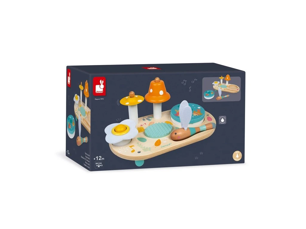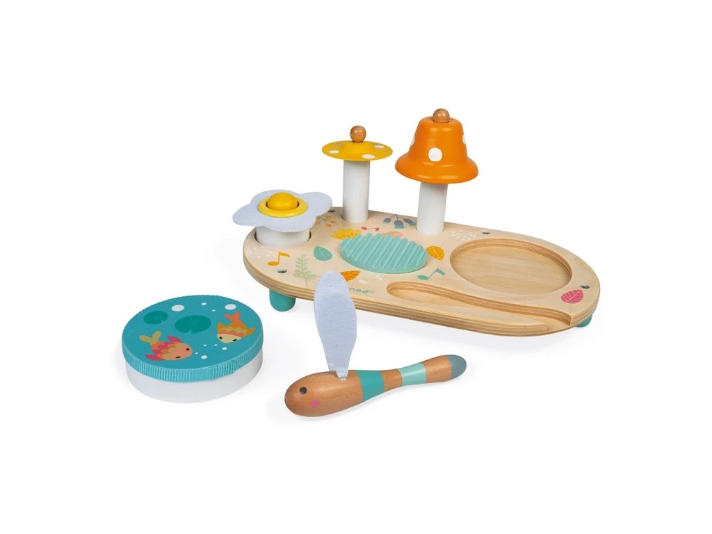 Dřevěný hudební stolek Confetti Janod Nádherný barevný hudební set pro malé hudebníky.