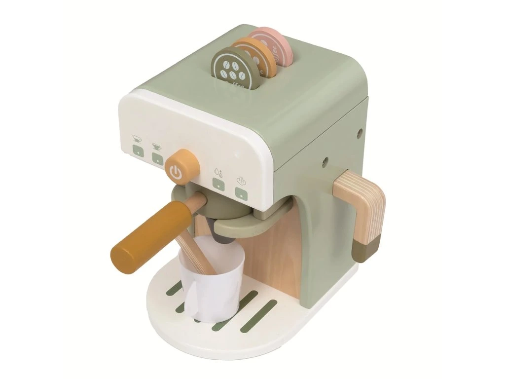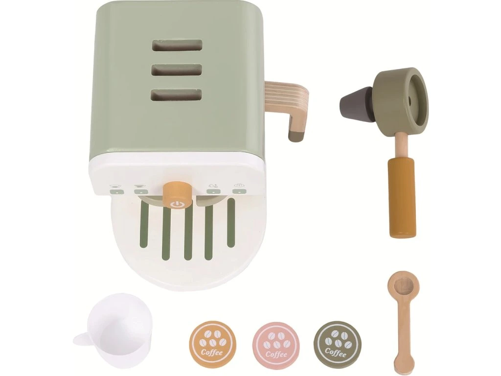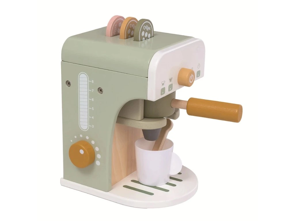 Sada kávovaru s doplňky pro všechny malé baristy, baristky a budoucí milovníky kávy. Je chuť na espresso nebo cappuccino? Dřevěný pákový kávovar s realistickými detaily nabízí dětem hru jako ve skutečné kavárně.