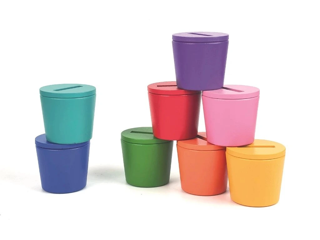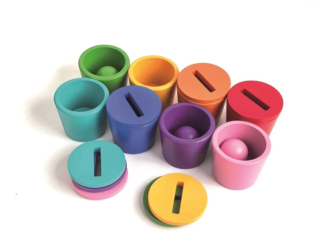 Zábavná dřevěná výuková hra inspirovaná Montessori hračkami. Dítě si nejlépe zdokonaluje své dovednosti pomocí hry. Umístěte pomocí lžičky kuličky do správných kalíšků podle barev a roztřiďte mince. Nasaďte kryt na kalíšek a pomocí čínských hůlek nebo pinzety poté umísťujte mince.