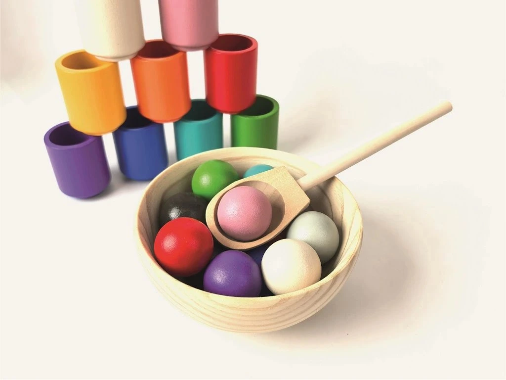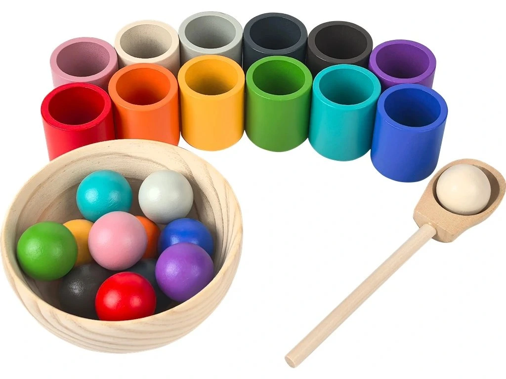 Zábavná dřevěná vzdělávací hra inspirovaná Montessori hračkami. Dítě si nejlépe zdokonaluje své dovednosti pomocí hry. Umístěte kuličky do správných kalíšků podle barev pomocí lžičky. Zvládnete to všechno ve správné barvě?