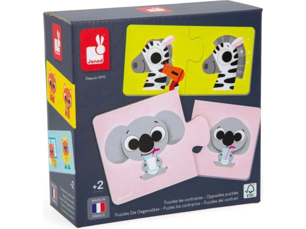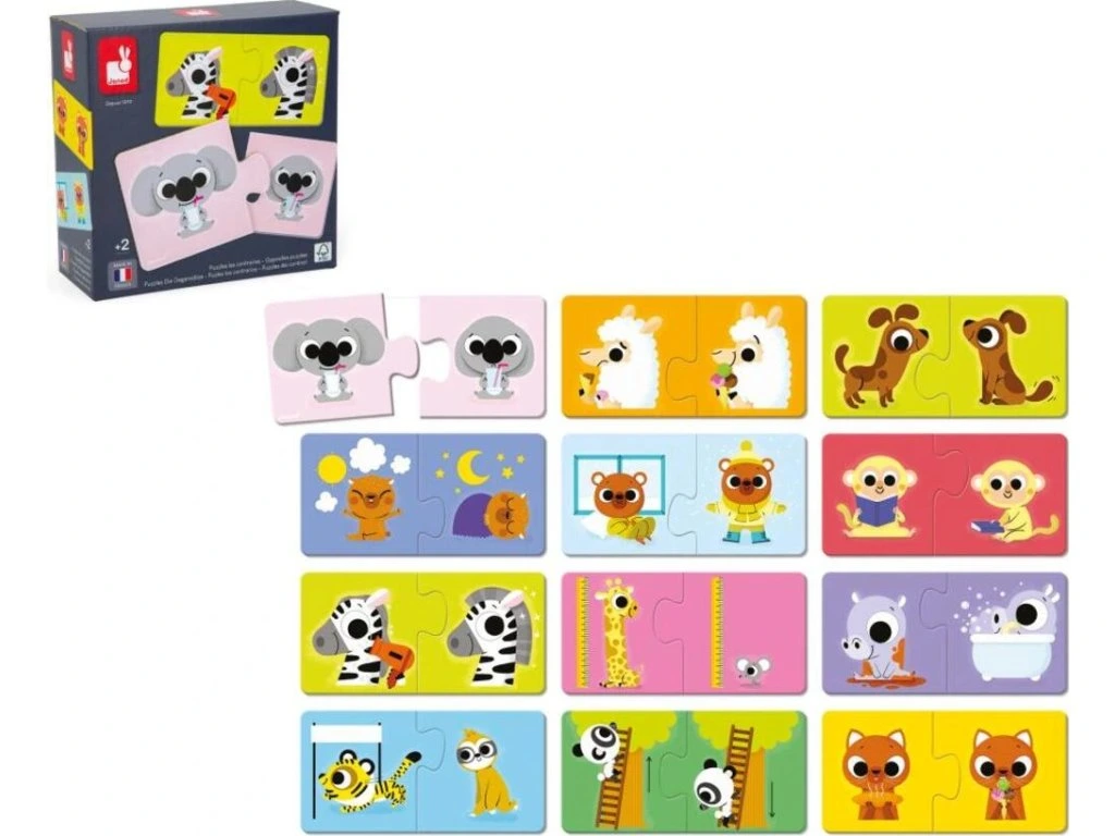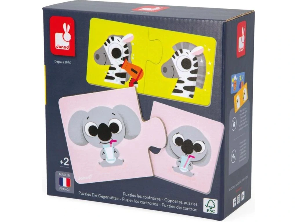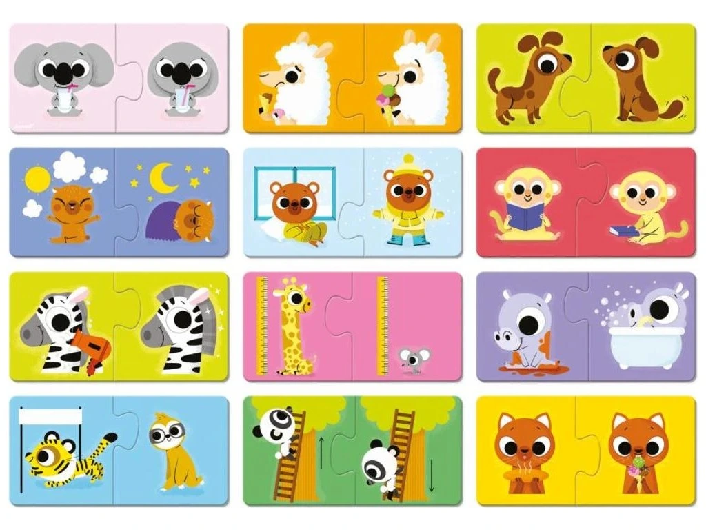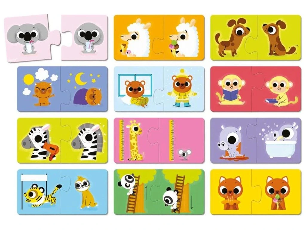 Co je opakem pomalého? Samozřejmě rychle! Těchto 12x 2-dílné puzzle s tematikou savců pomáhají dětem poznávat opačná slova a situace hravou formou. Děti si tak rozšiřují slovní zásobu a zároveň podporují logické myšlení.