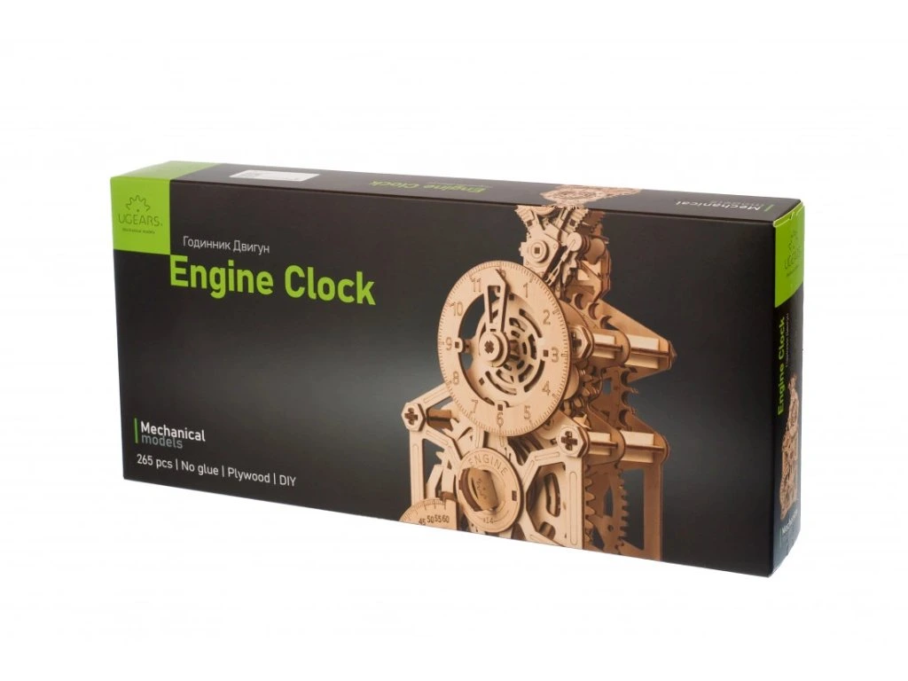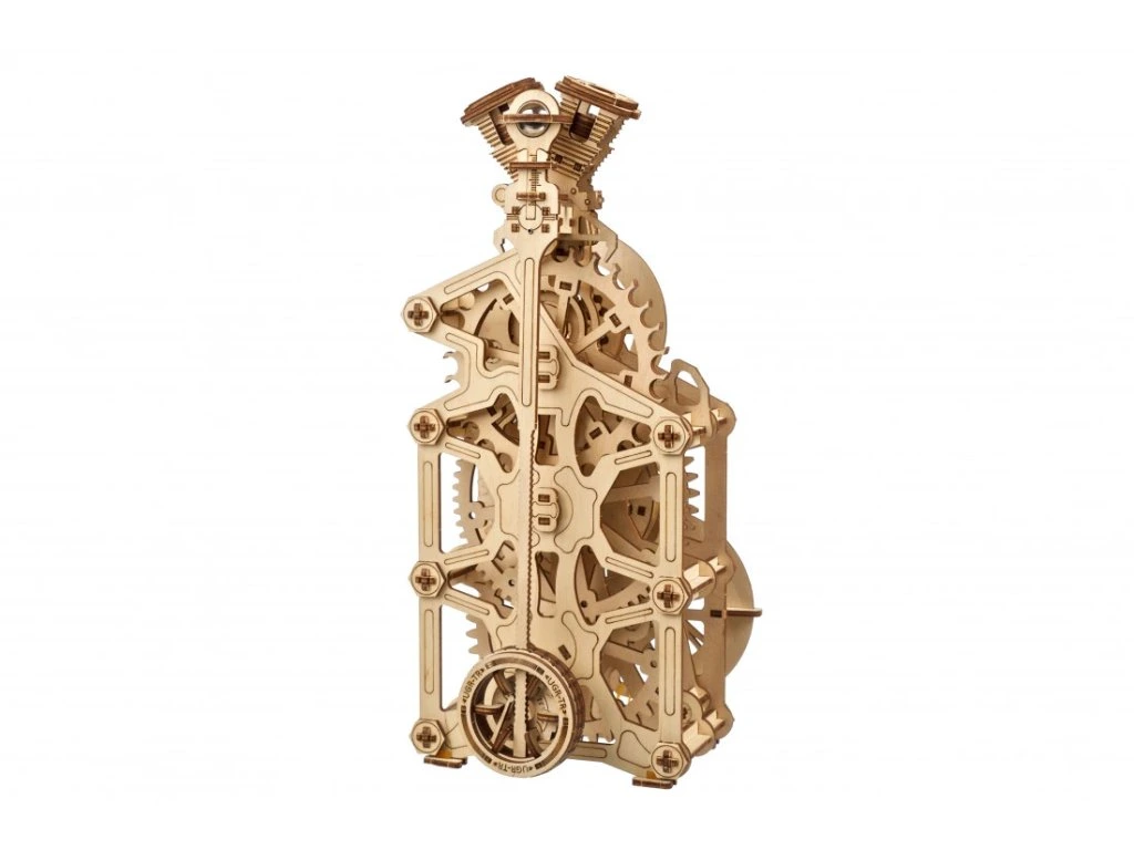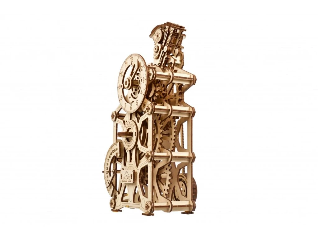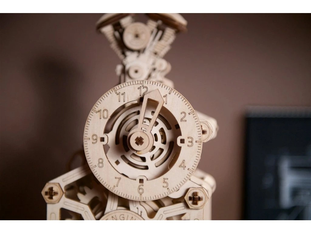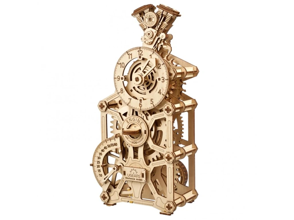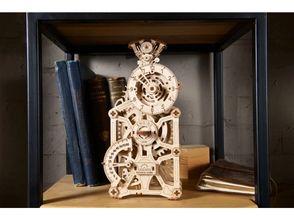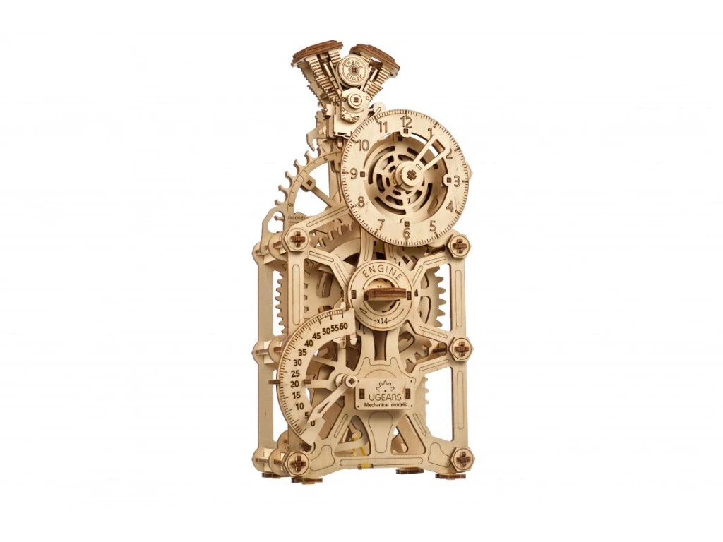 Znáte ten pocit, když je motor perfektně naladěný a funguje jako švýcarské hodinky? Převrátíme to a představujeme vám Hodinový Motor od UGEARS – mistrovské dílo, které funguje (a vypadá) jako motor! Tento funkční mechanický stolní hodinový stroj s kyvadlem je celý provedený v automobilové tématice. Na vrcholu najdete design bloku motoru s pohybujícími se písty a čas zobrazený ve stylu rychloměru (hodiny) a otáčkoměru (minuty). Kyvadlo hodín a záchyt způsobují příjemný tikající zvuk, přičemž uběhlé sekundy jsou zobrazeny na záchytu vzadu na hodinách. Hodinový Motor ukazuje čas až 5 hodin po jednom natažení (provozní čas lze prodloužit o dalších 60 až 90 minut, pokud jsou písty uvolněné). Retrográdní mechanismus na minutové ručičce se automaticky resetuje po 60 minutách.